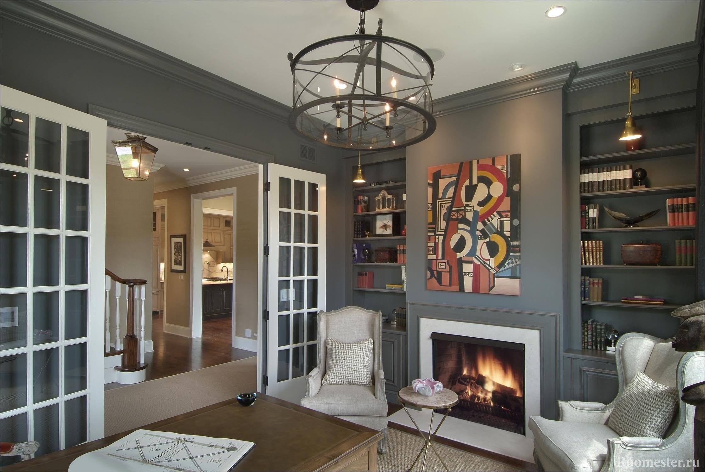 Камин и книжные полки в интерьере