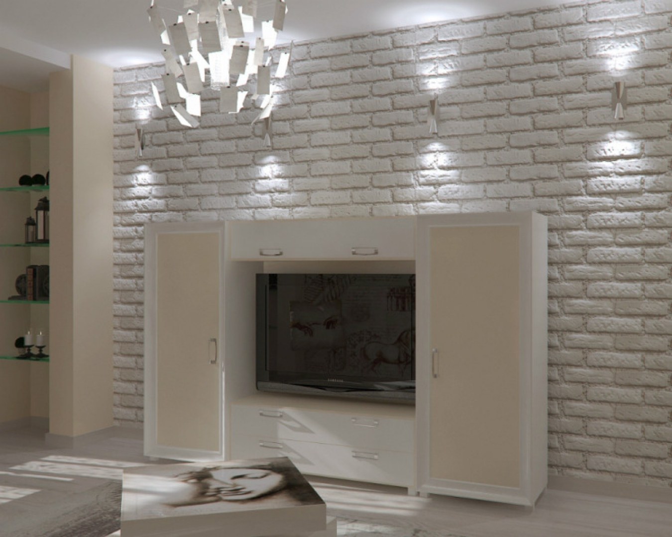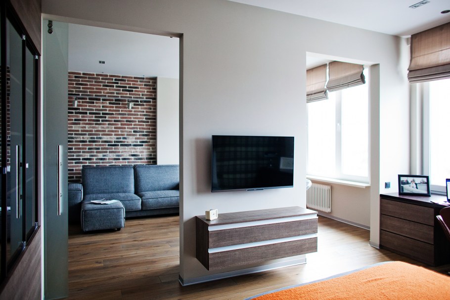 Телевизор на кирпичной стене в интерьере