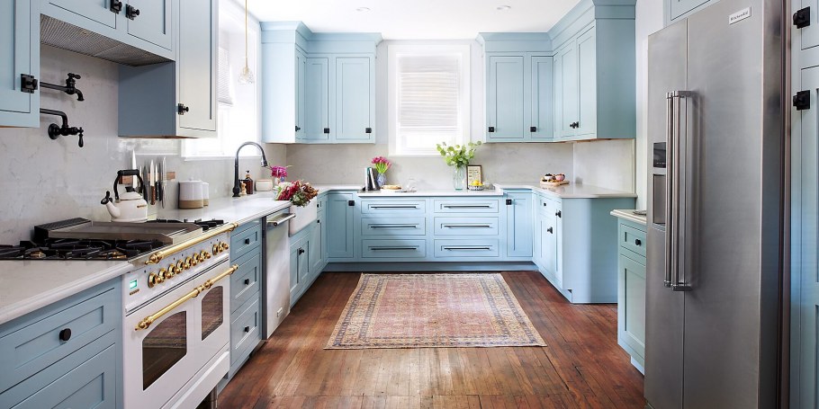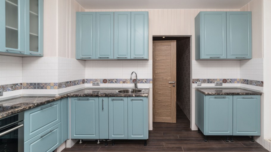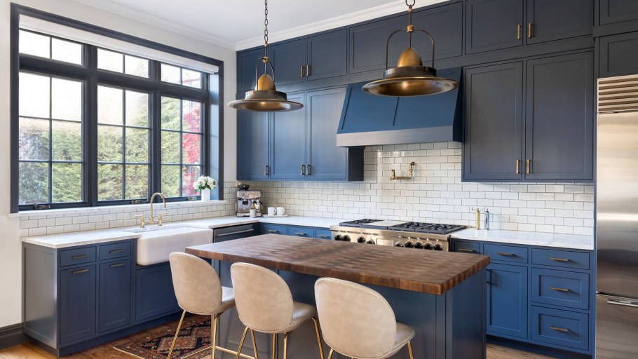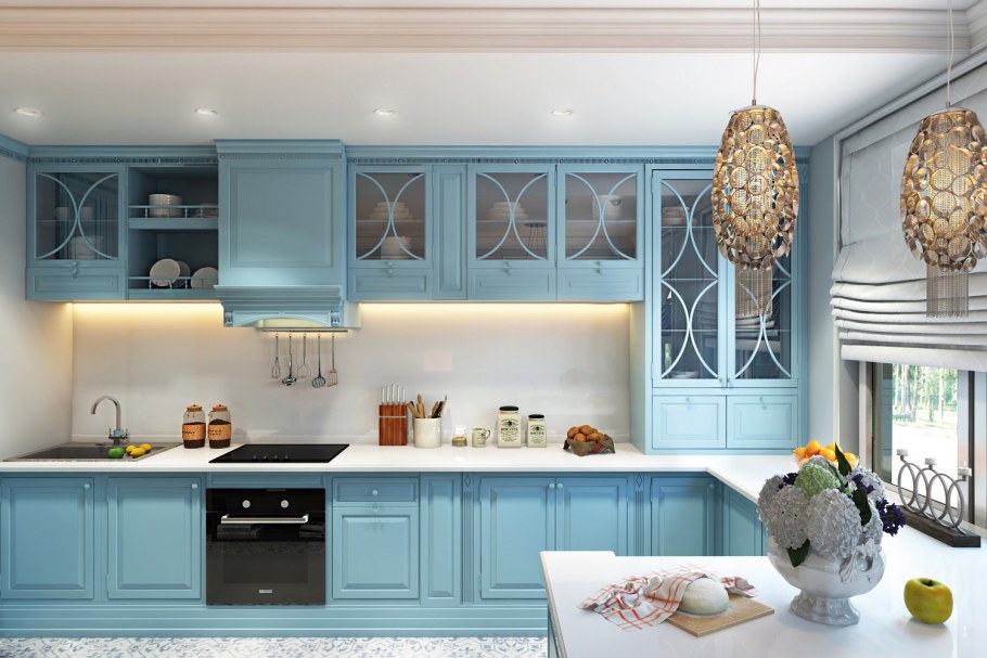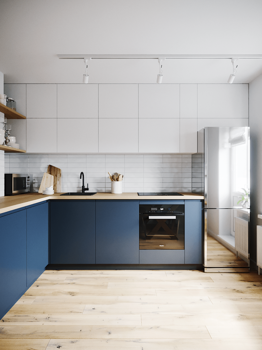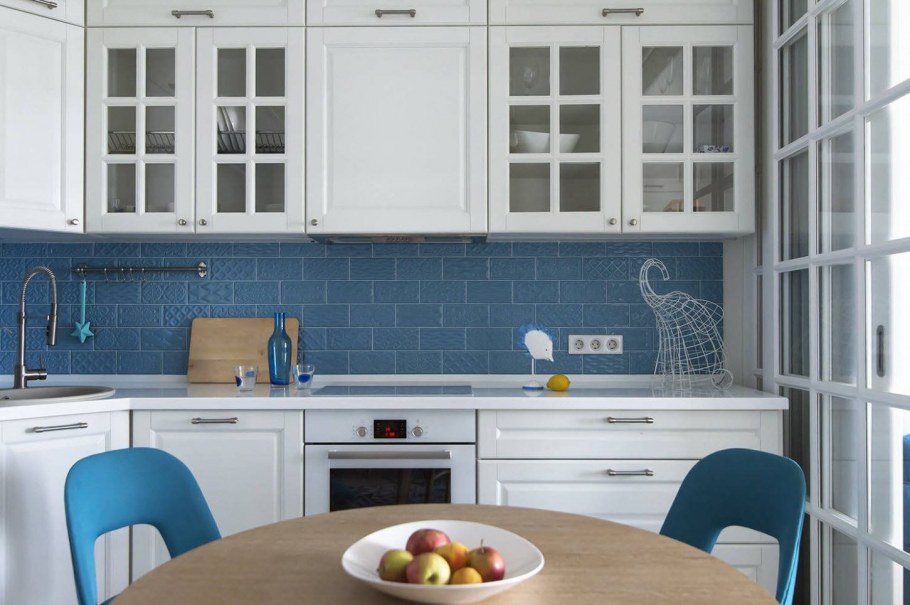 Бело голубая кухня с деревянной столешницей (47 фото)
