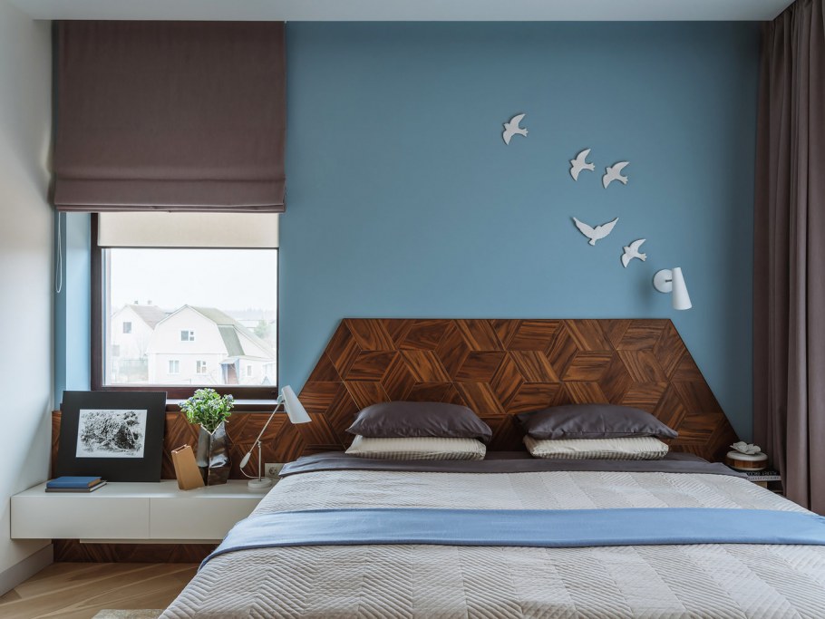 Гостиная с 2 окнами на одной стене с акцентной стеной за диваном