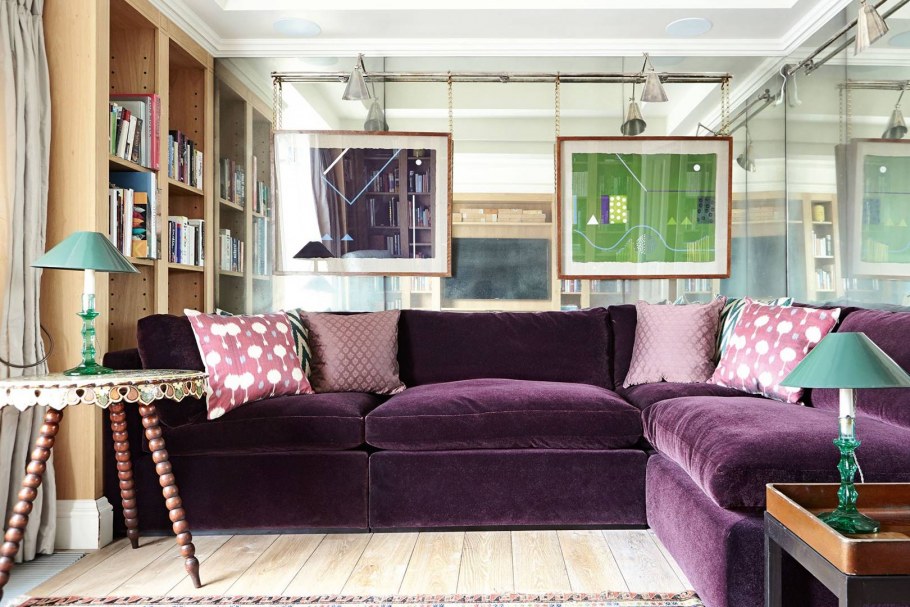 Фиолетовый диван в интерьере в гостиной (46 фото)