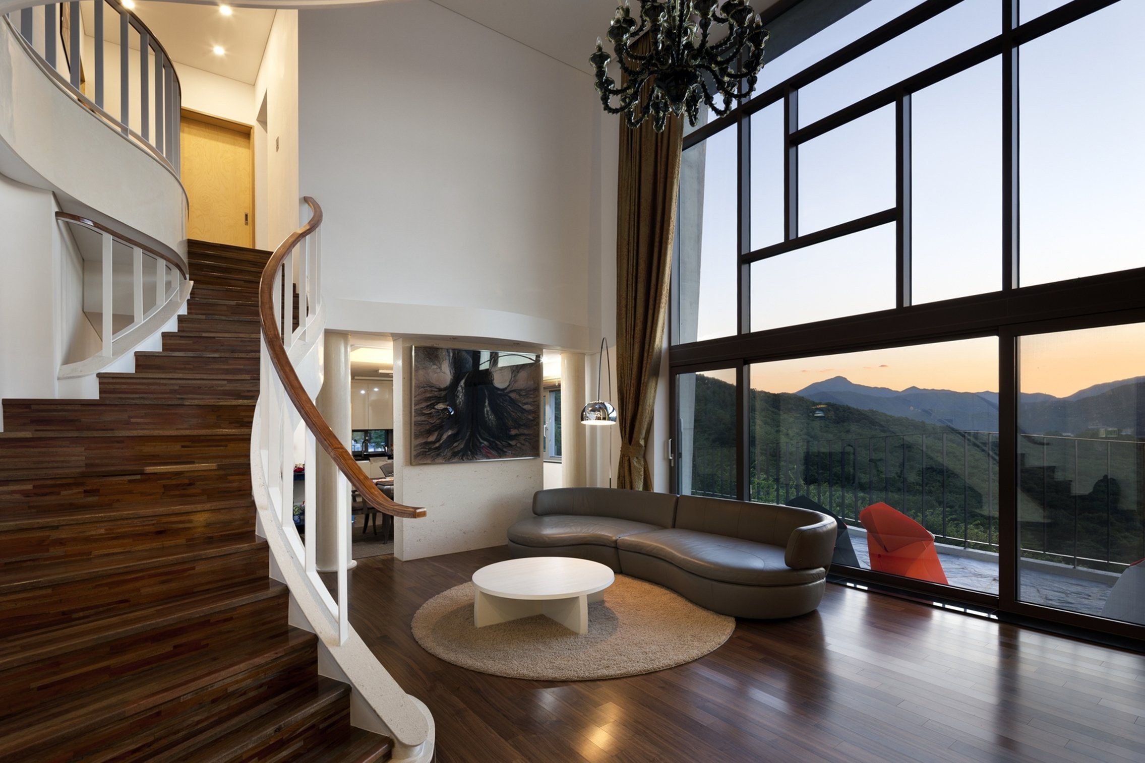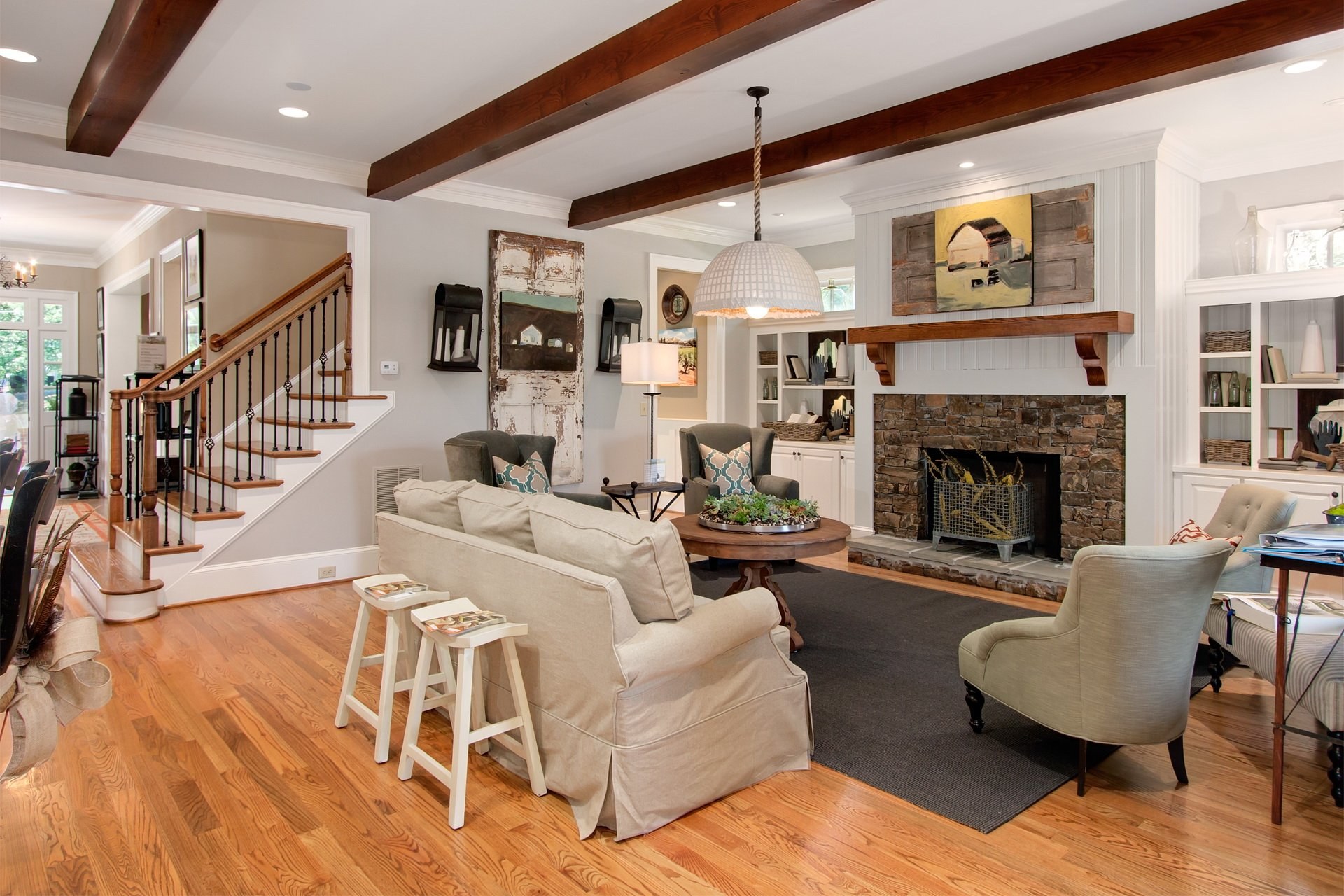 Гостиная с деревянной лестницей