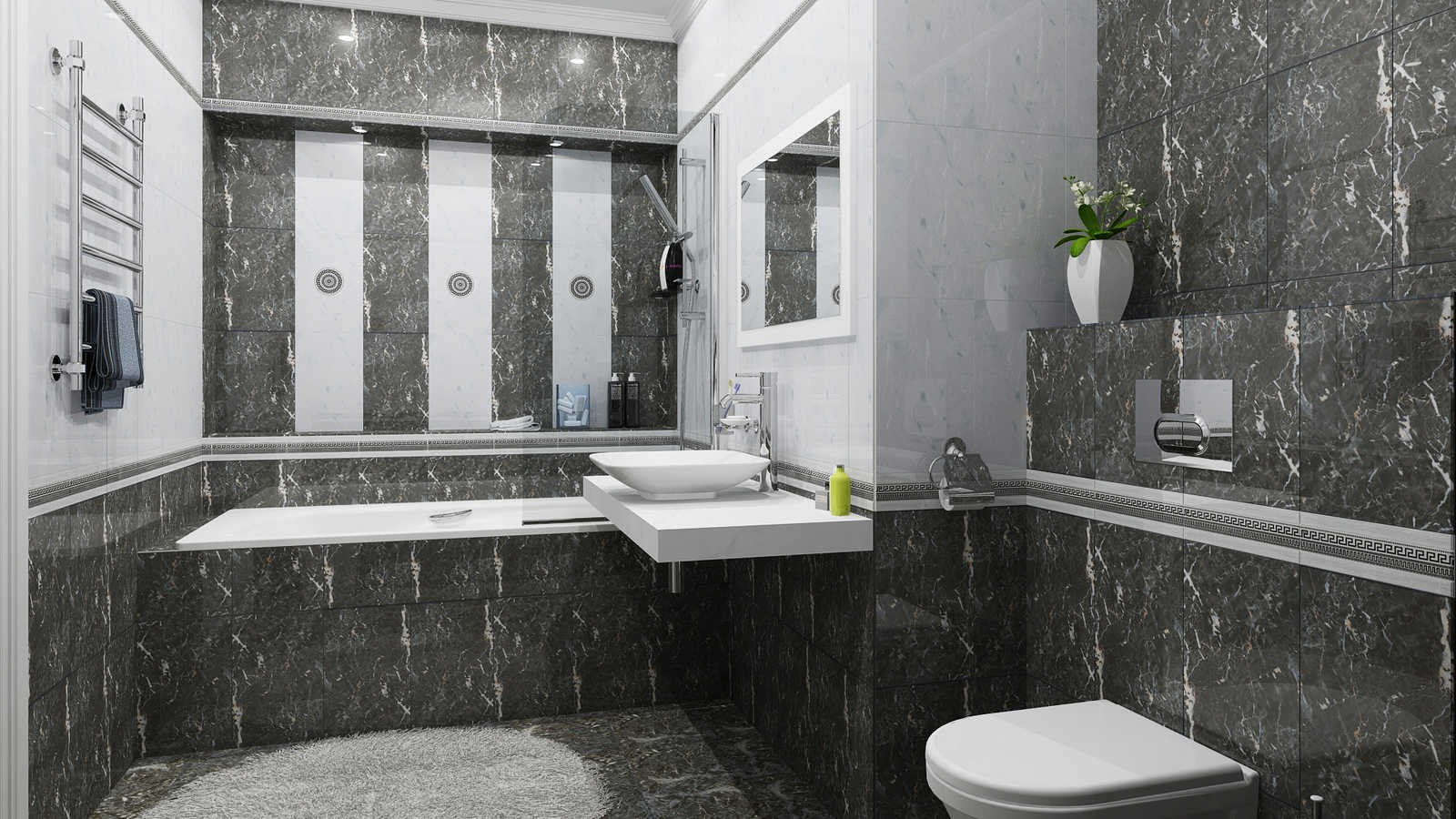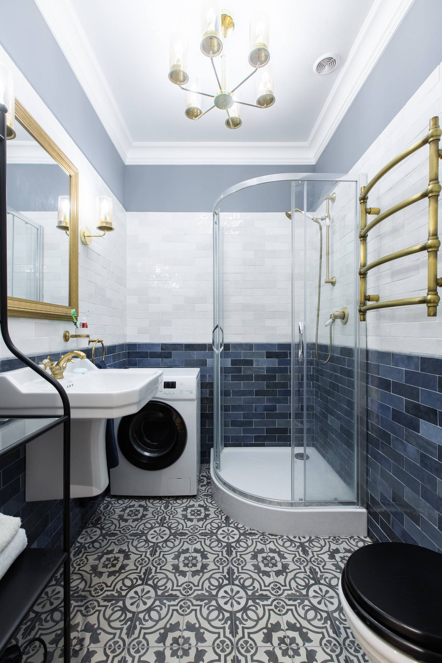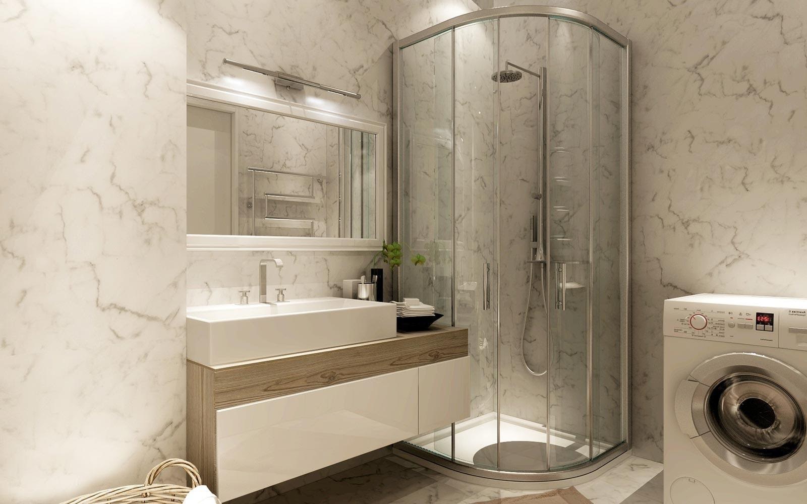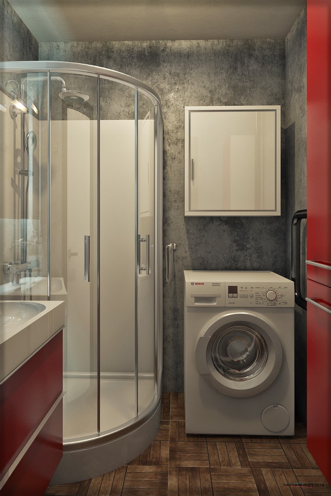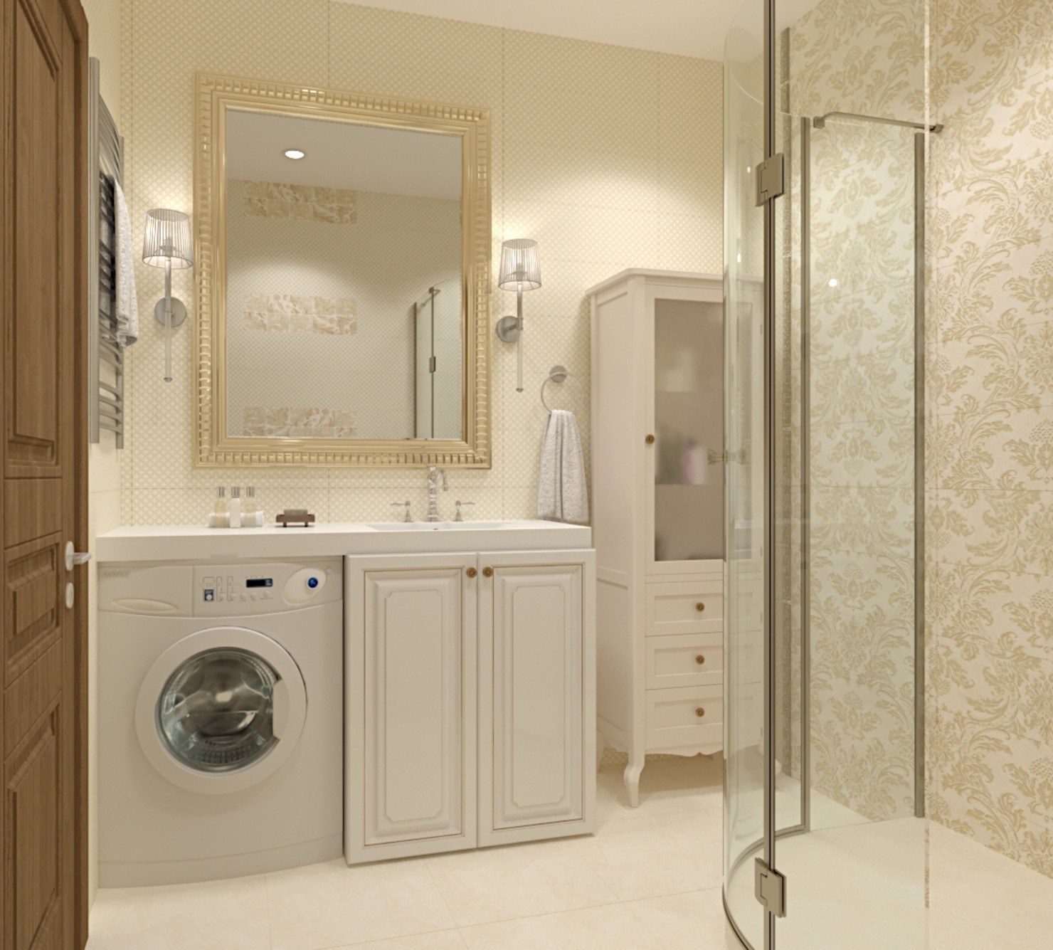 Дизайн ванной комнаты плитка с душевой кабиной и стиральной машиной (51 фото)
