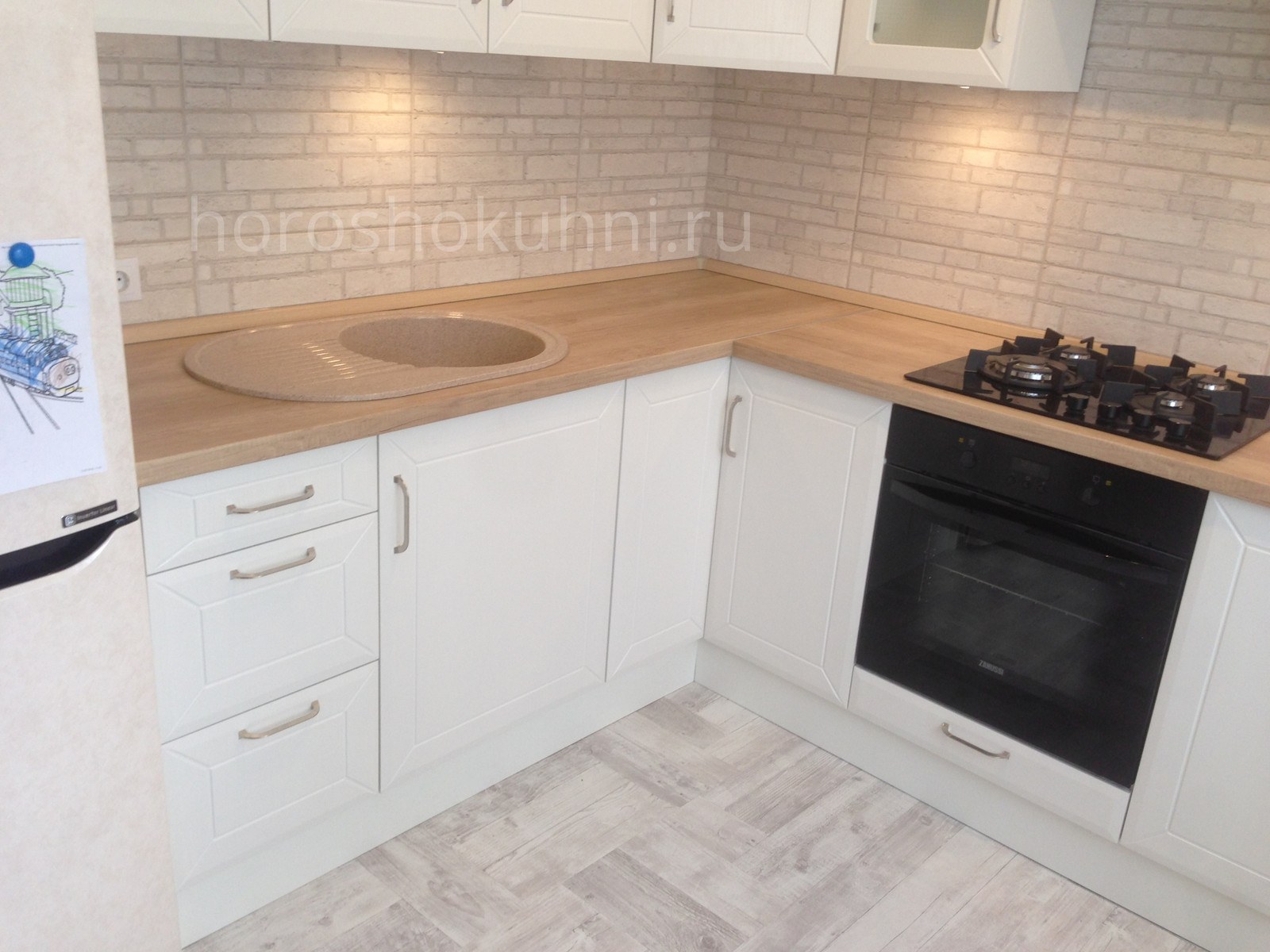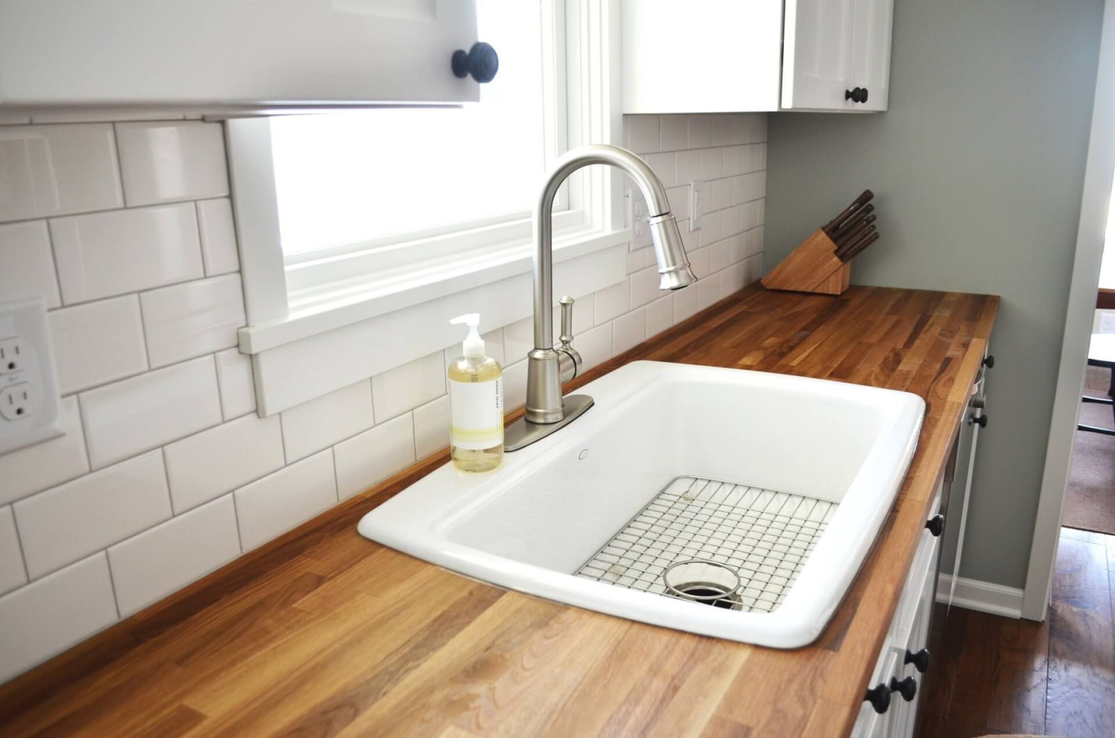 Раковина для белой кухни с деревянной столешницей (40 фото)