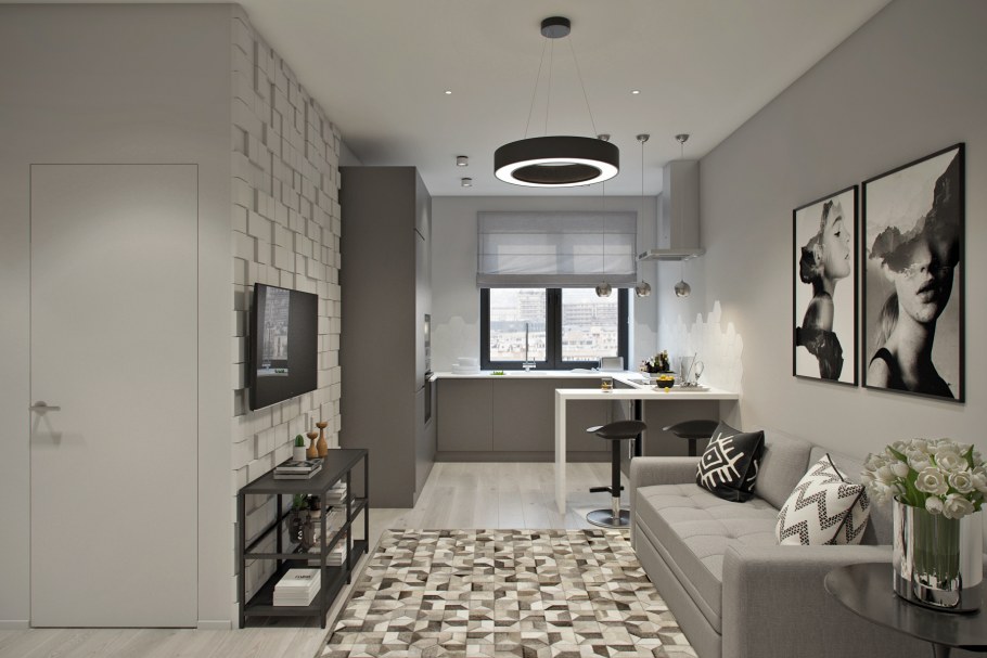 Однокомнатная квартира в серо белых тонах (52 фото)