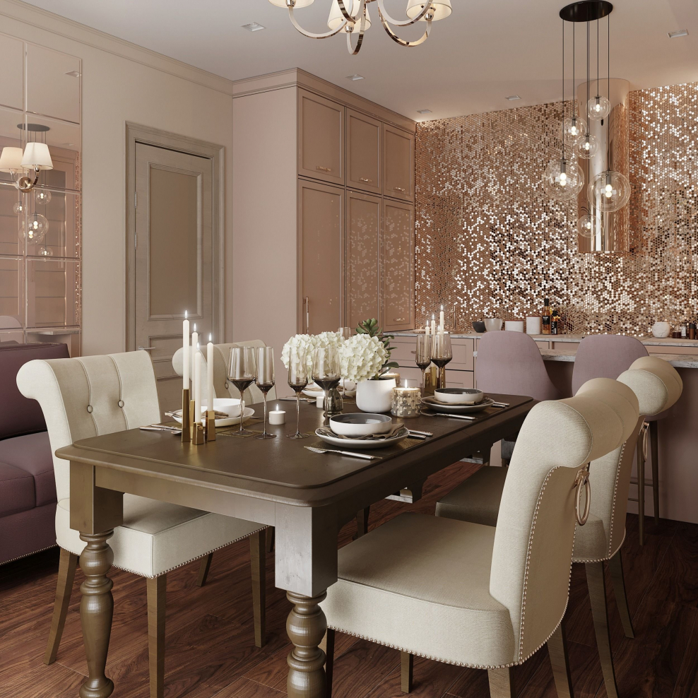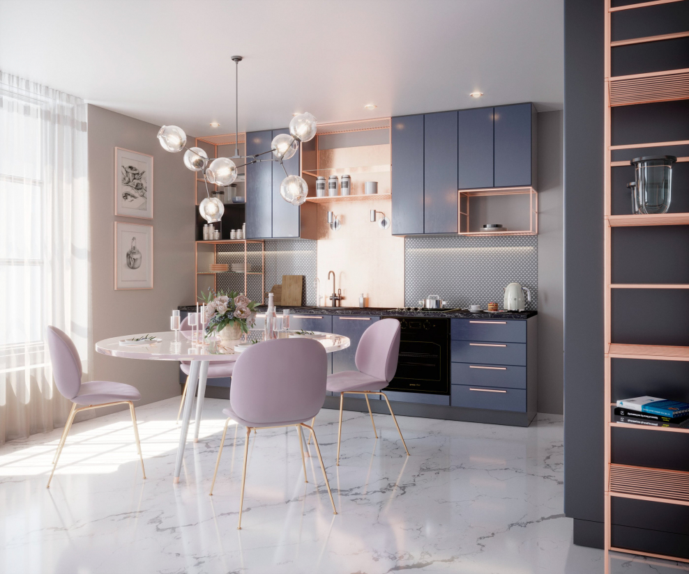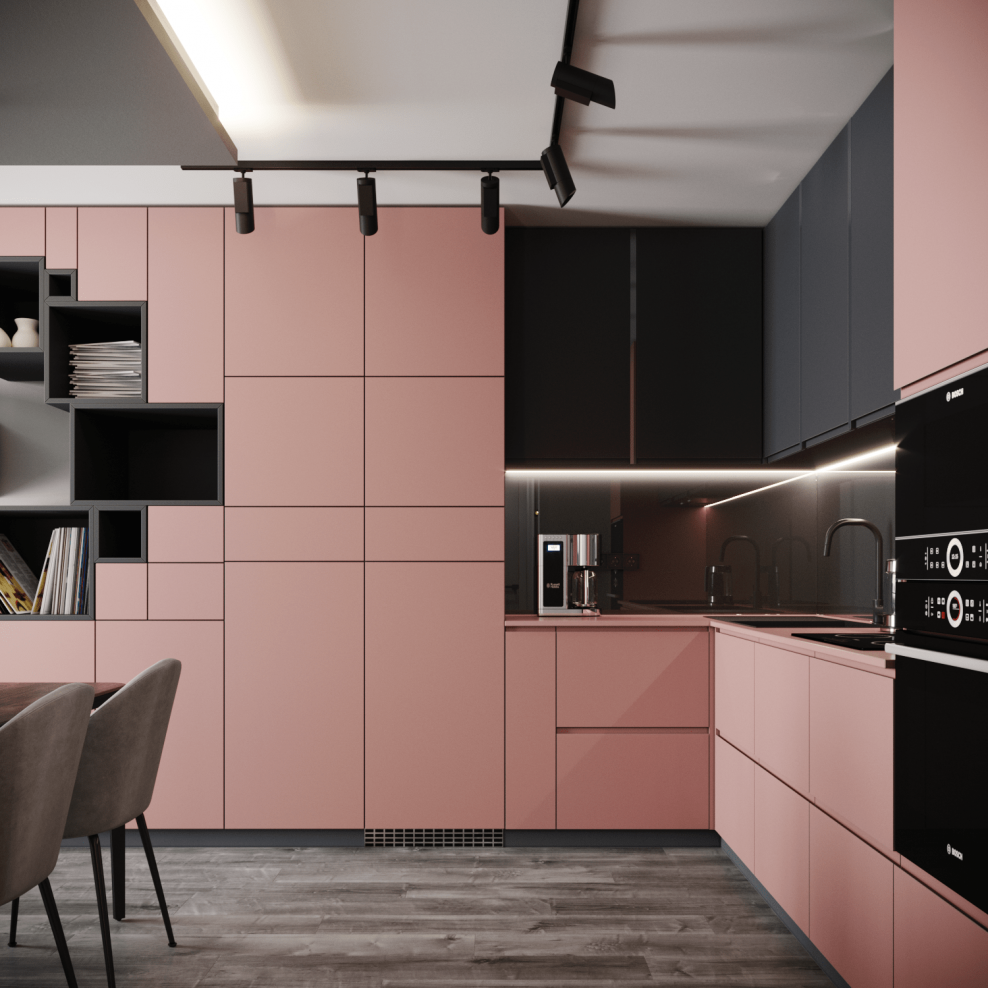 Пыльно розовый цвет в интерьере кухни