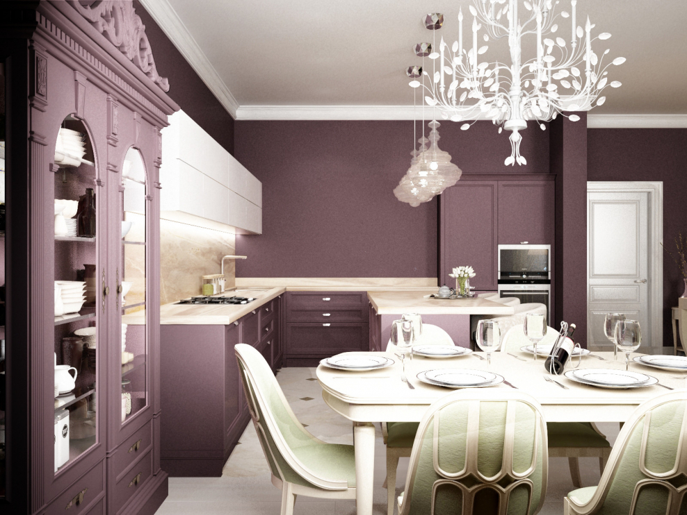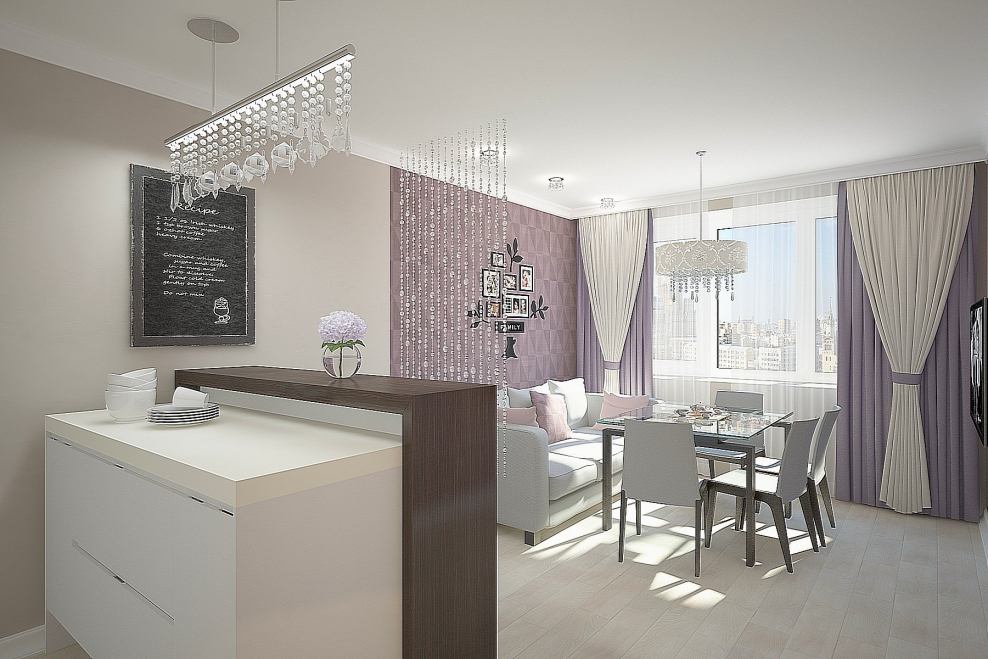 Кухня гостиная в бело сиреневых тонах