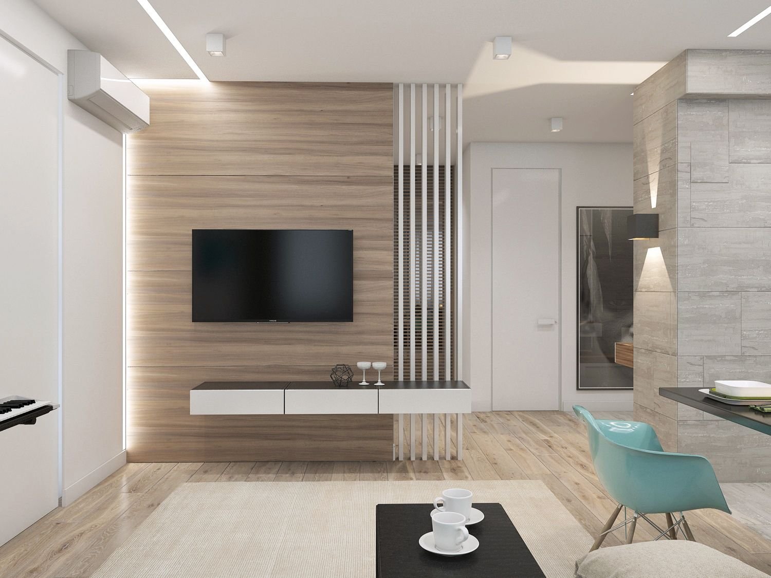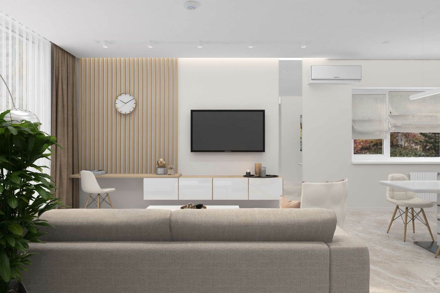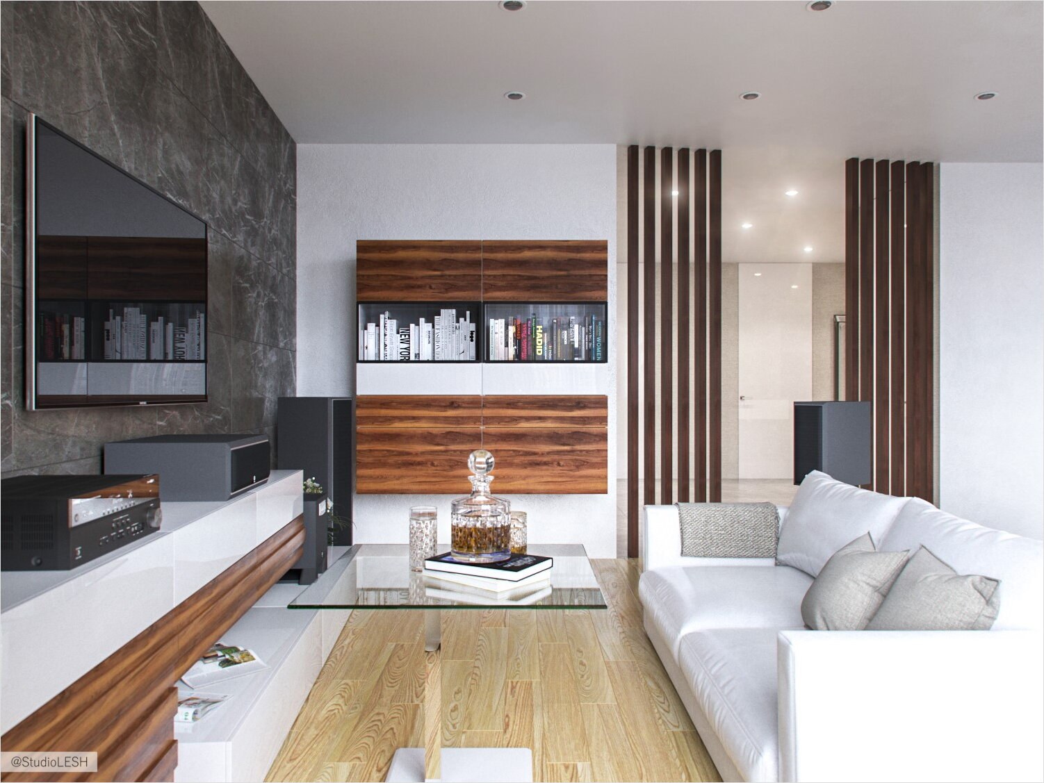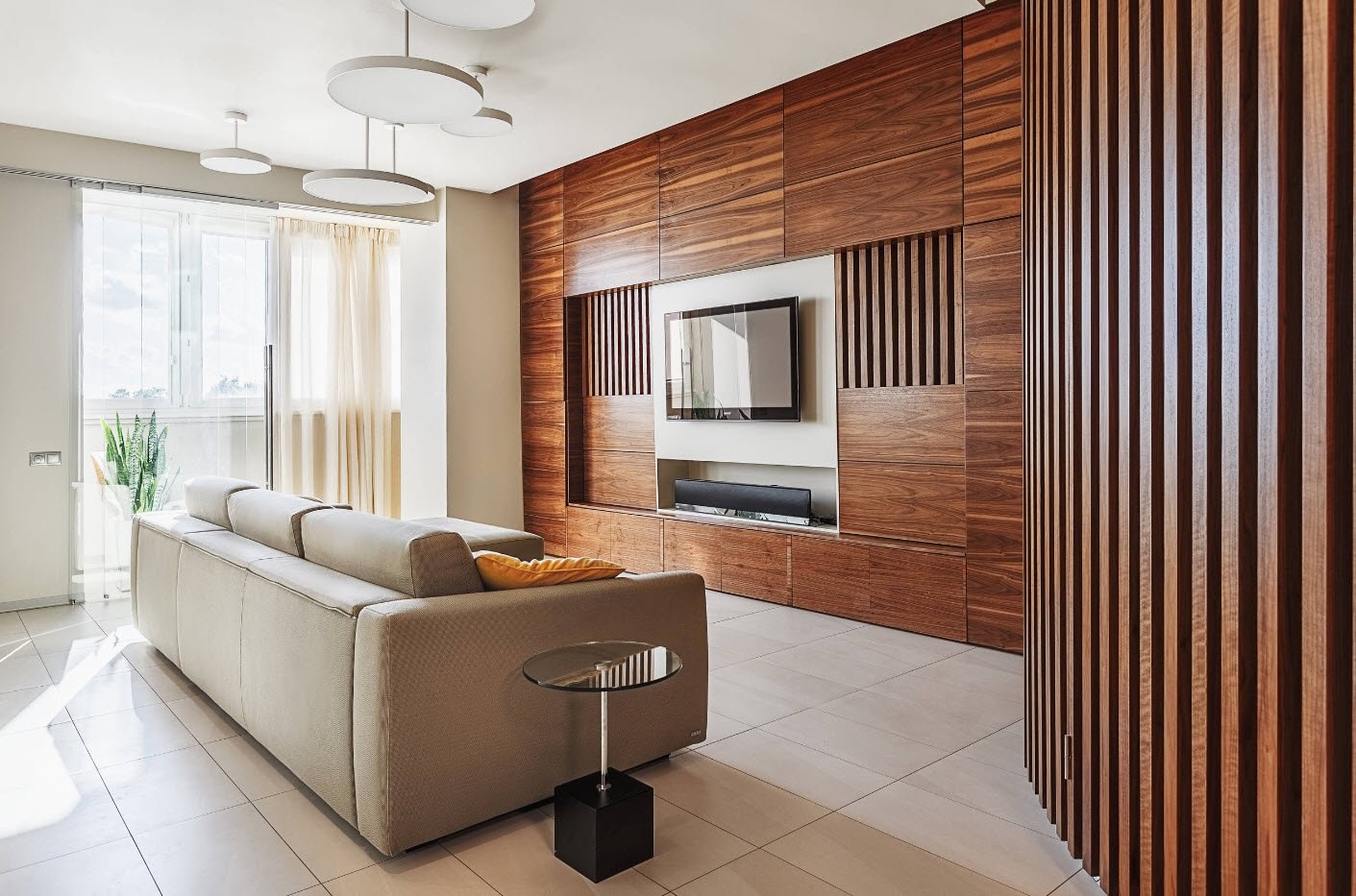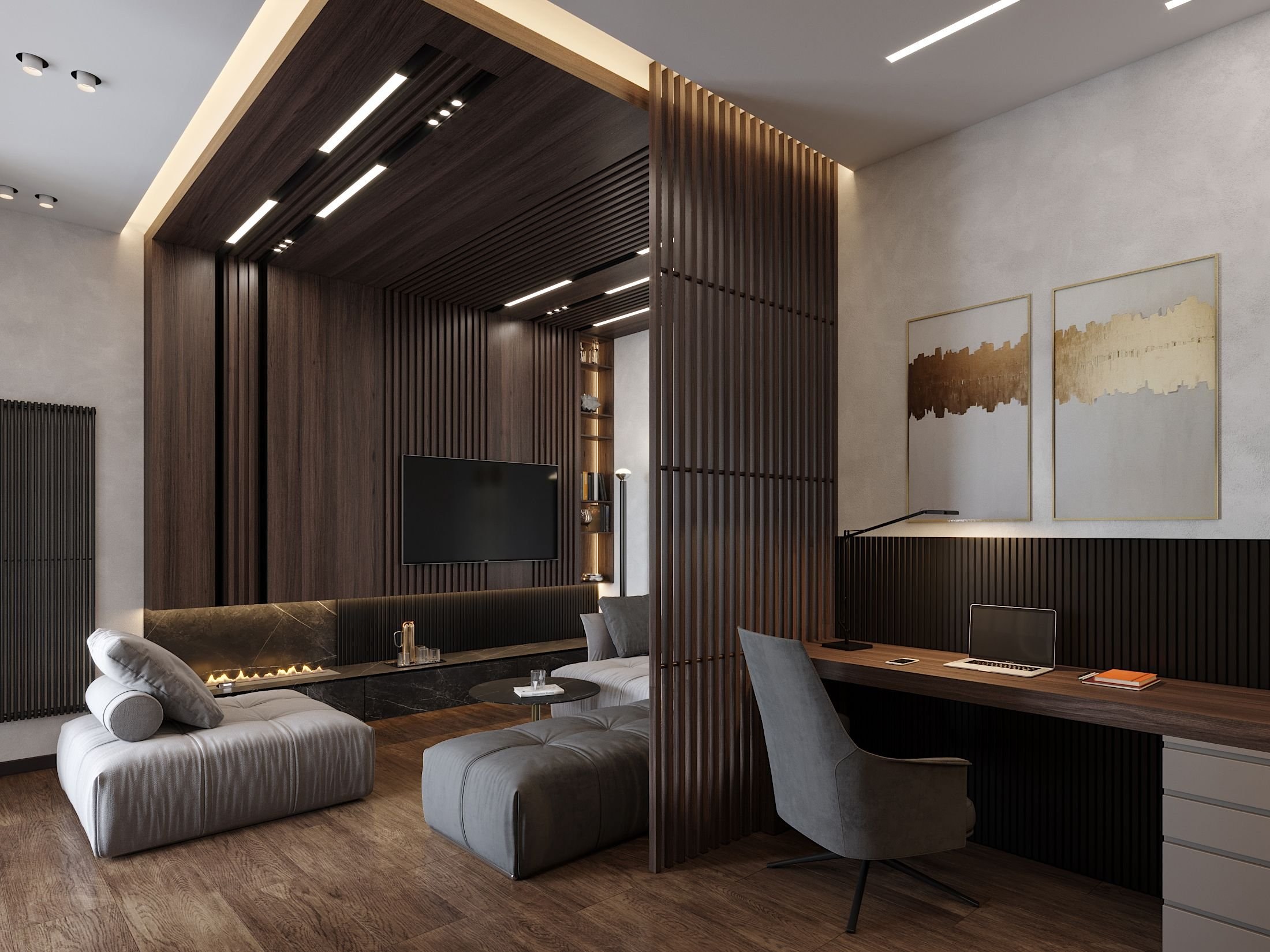 Гостиная в современном стиле с рейками