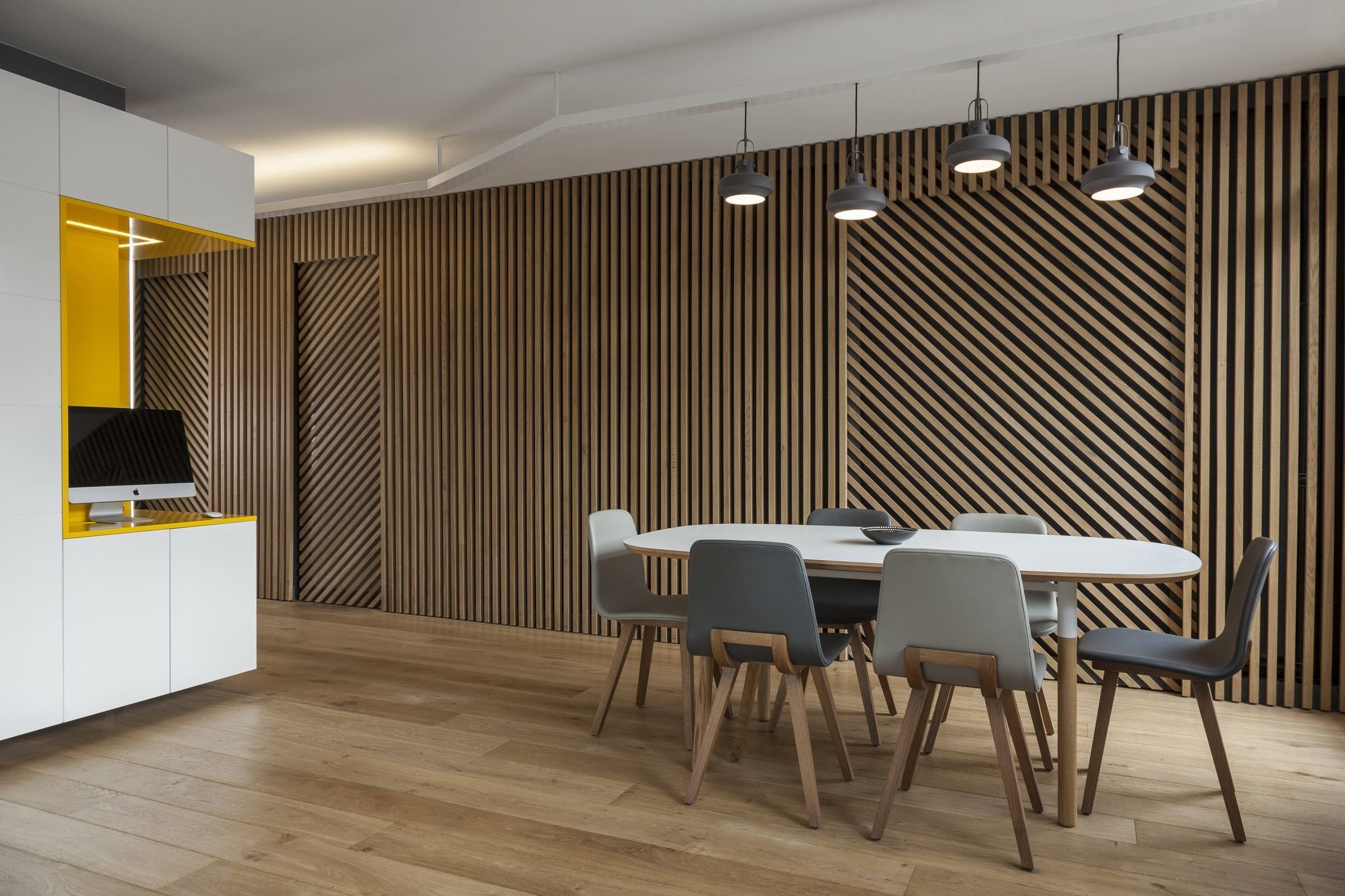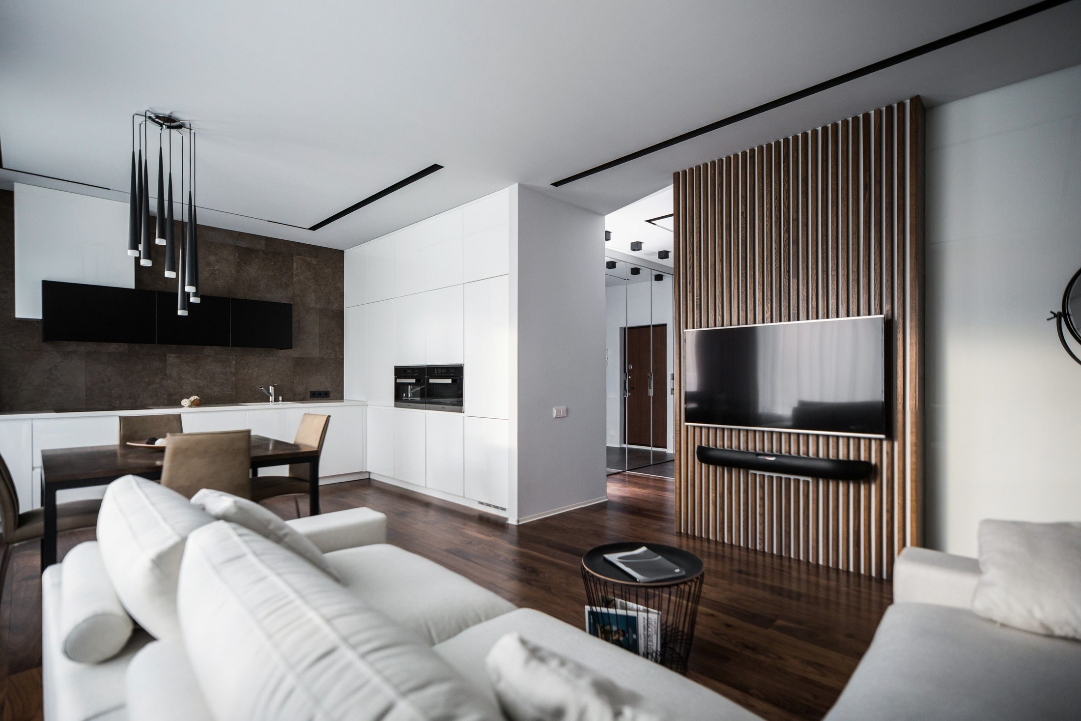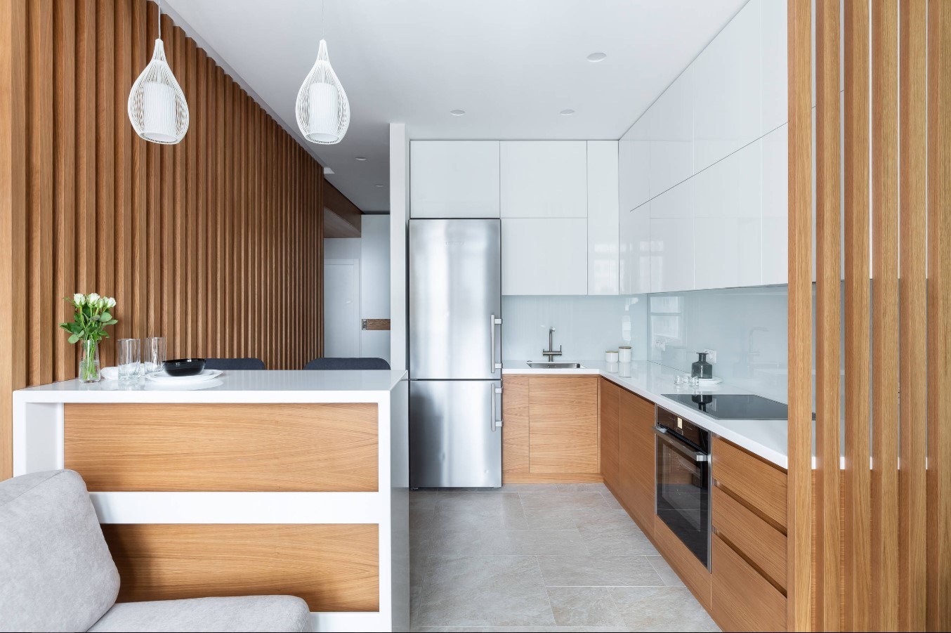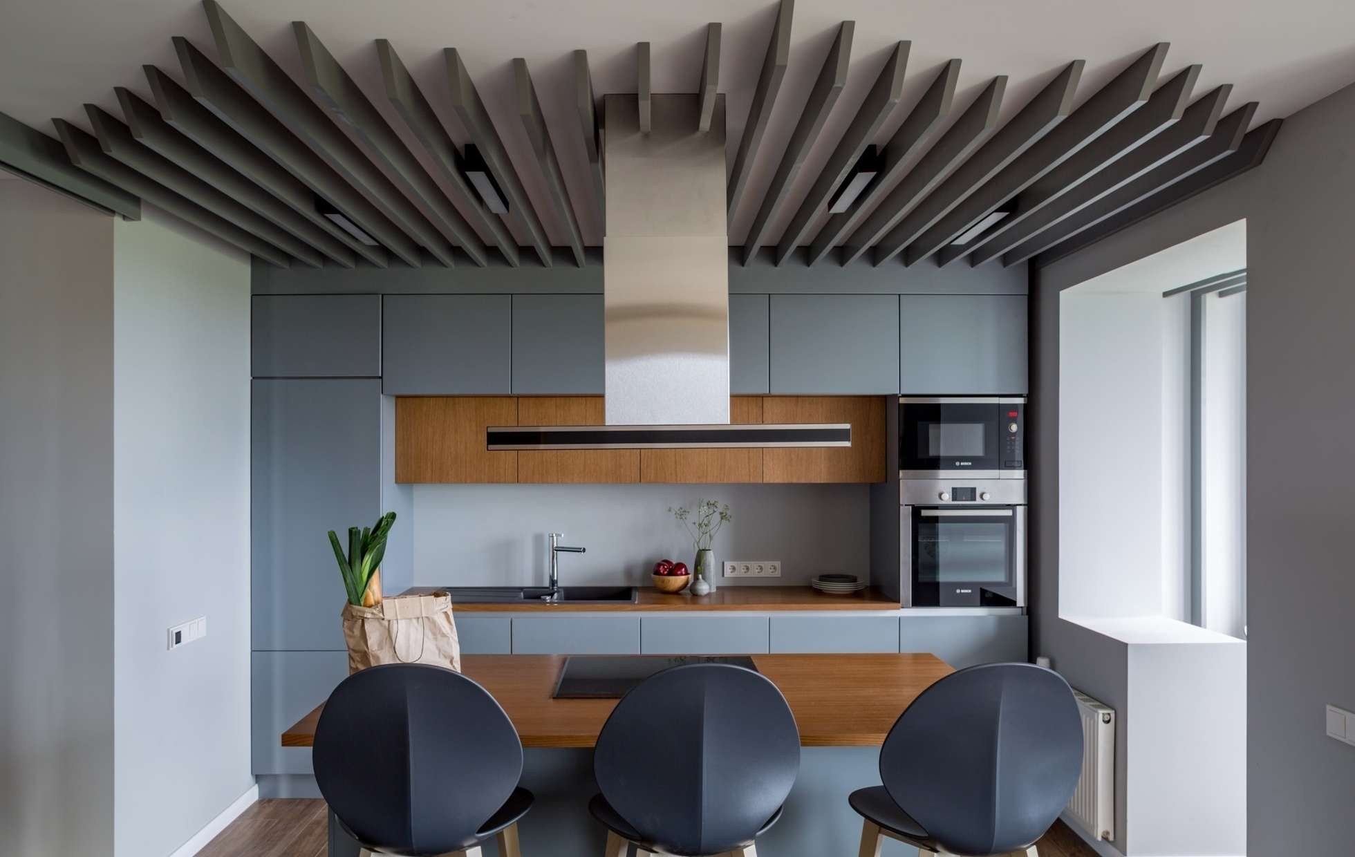Деревянные рейки в кухне-гостиной