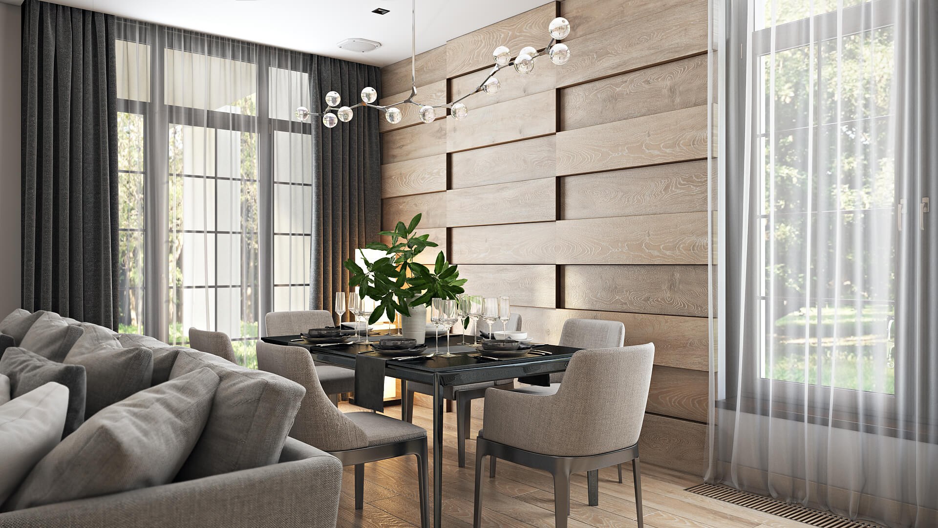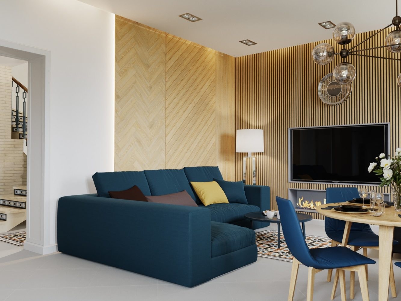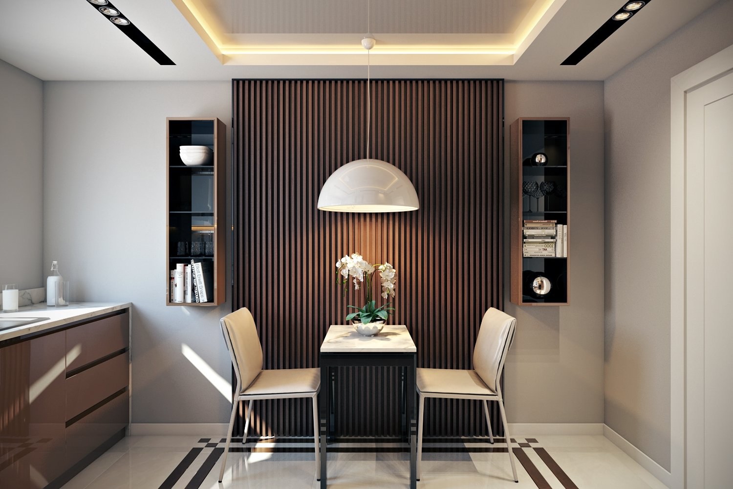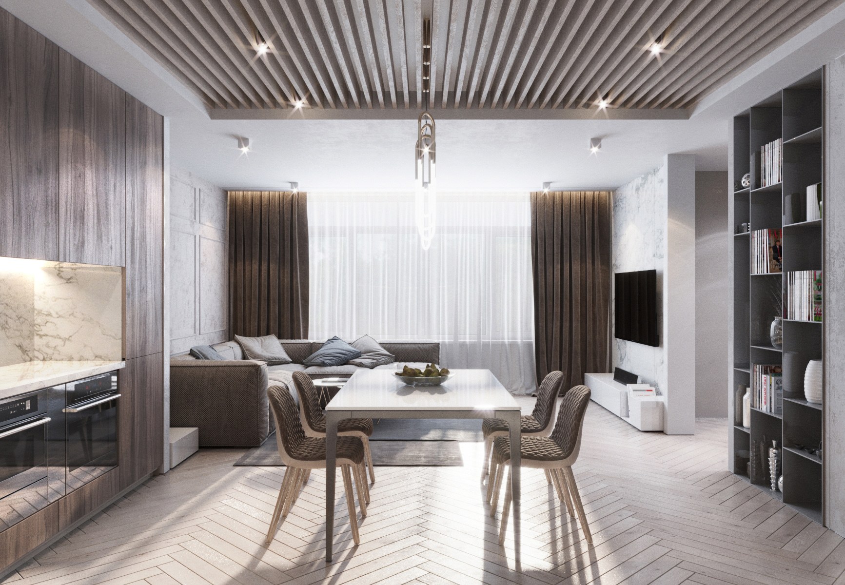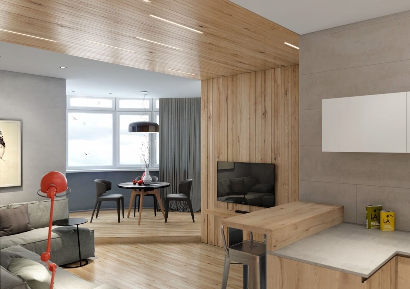 Деревянные рейки в кухне-гостиной