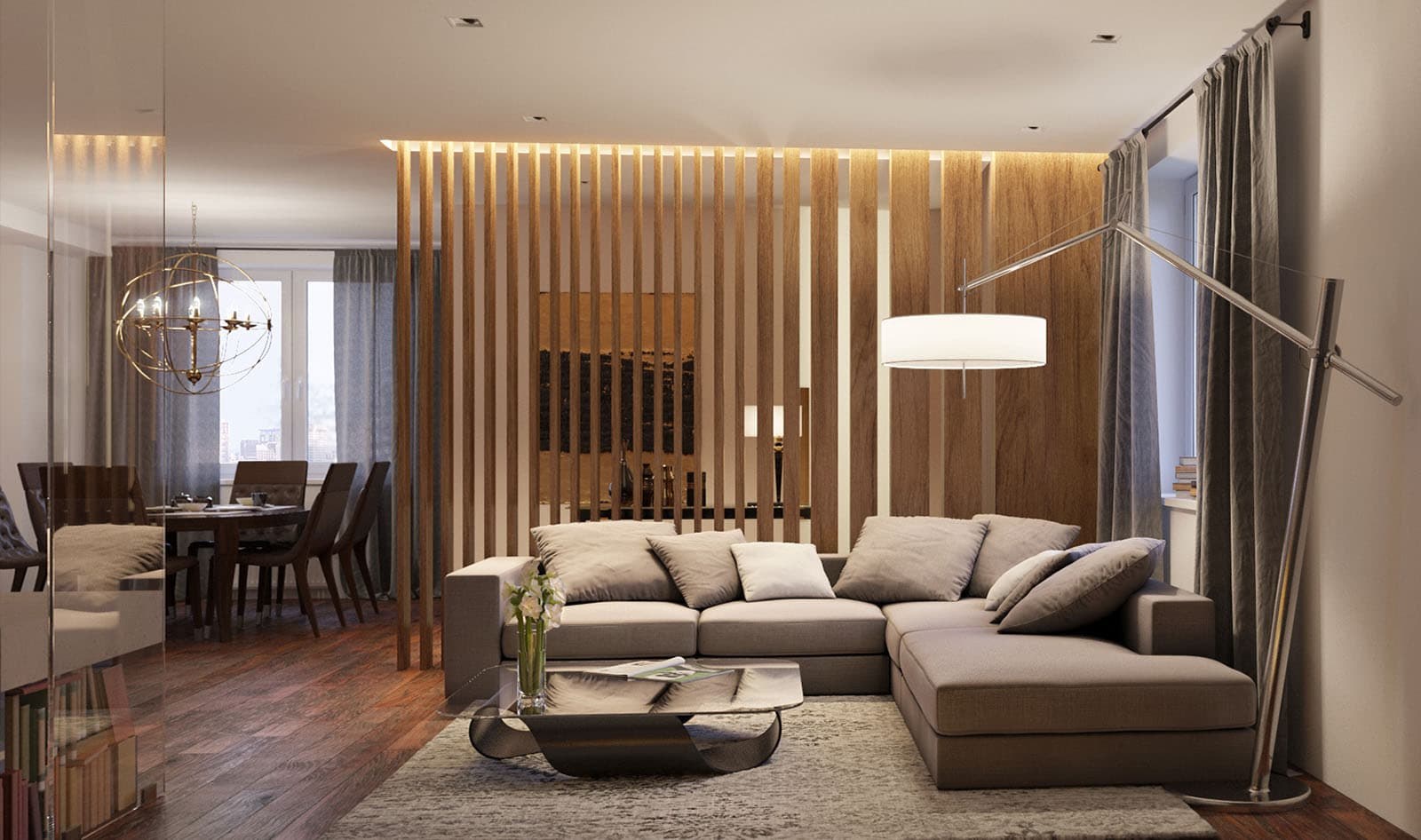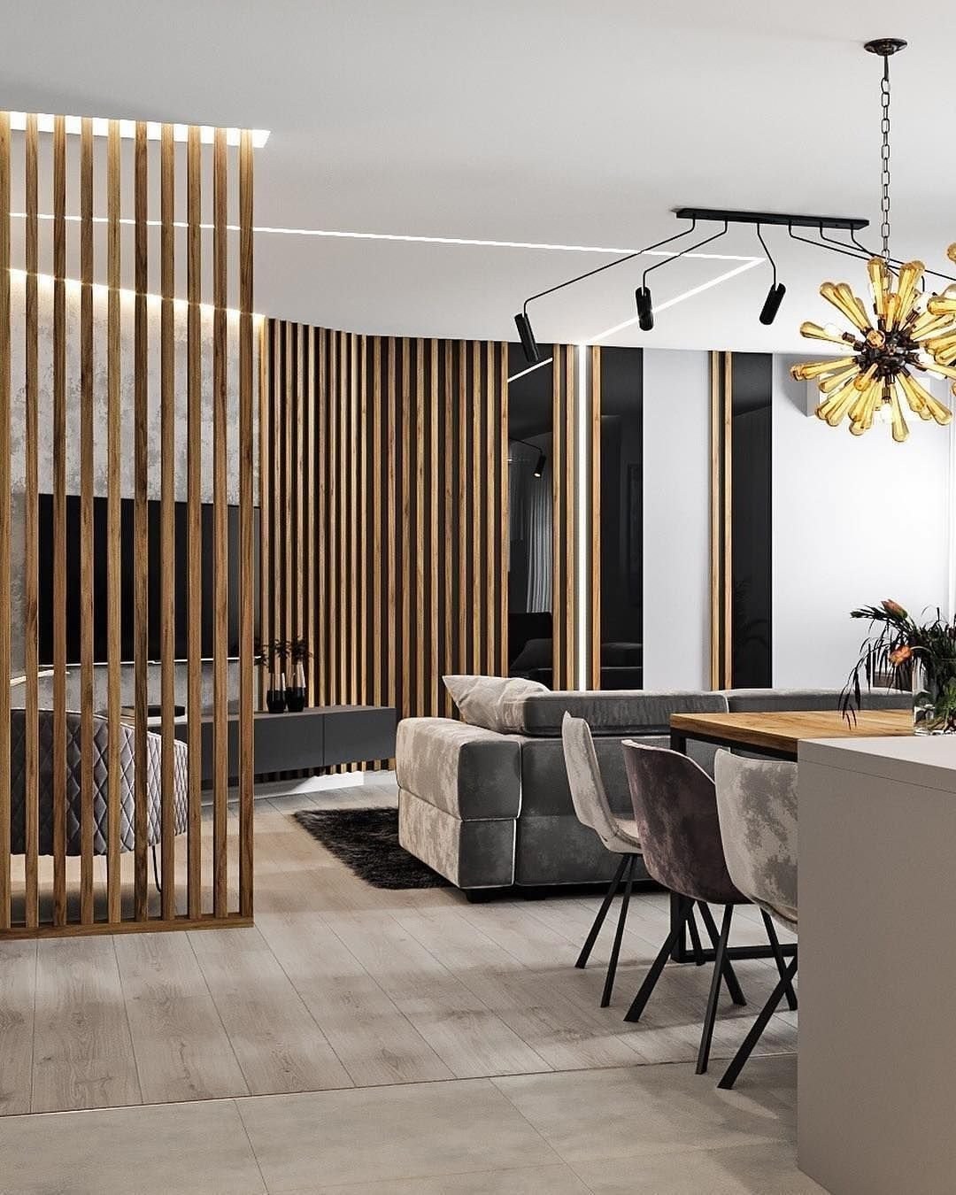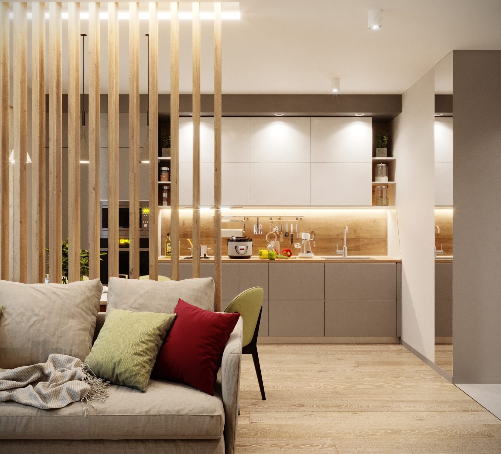 Кухня гостиная с реечной перегородкой
