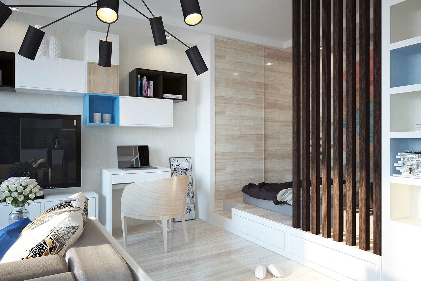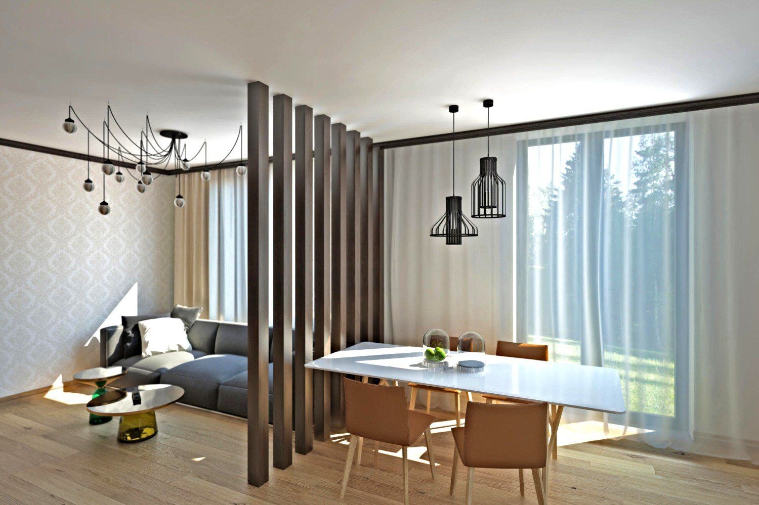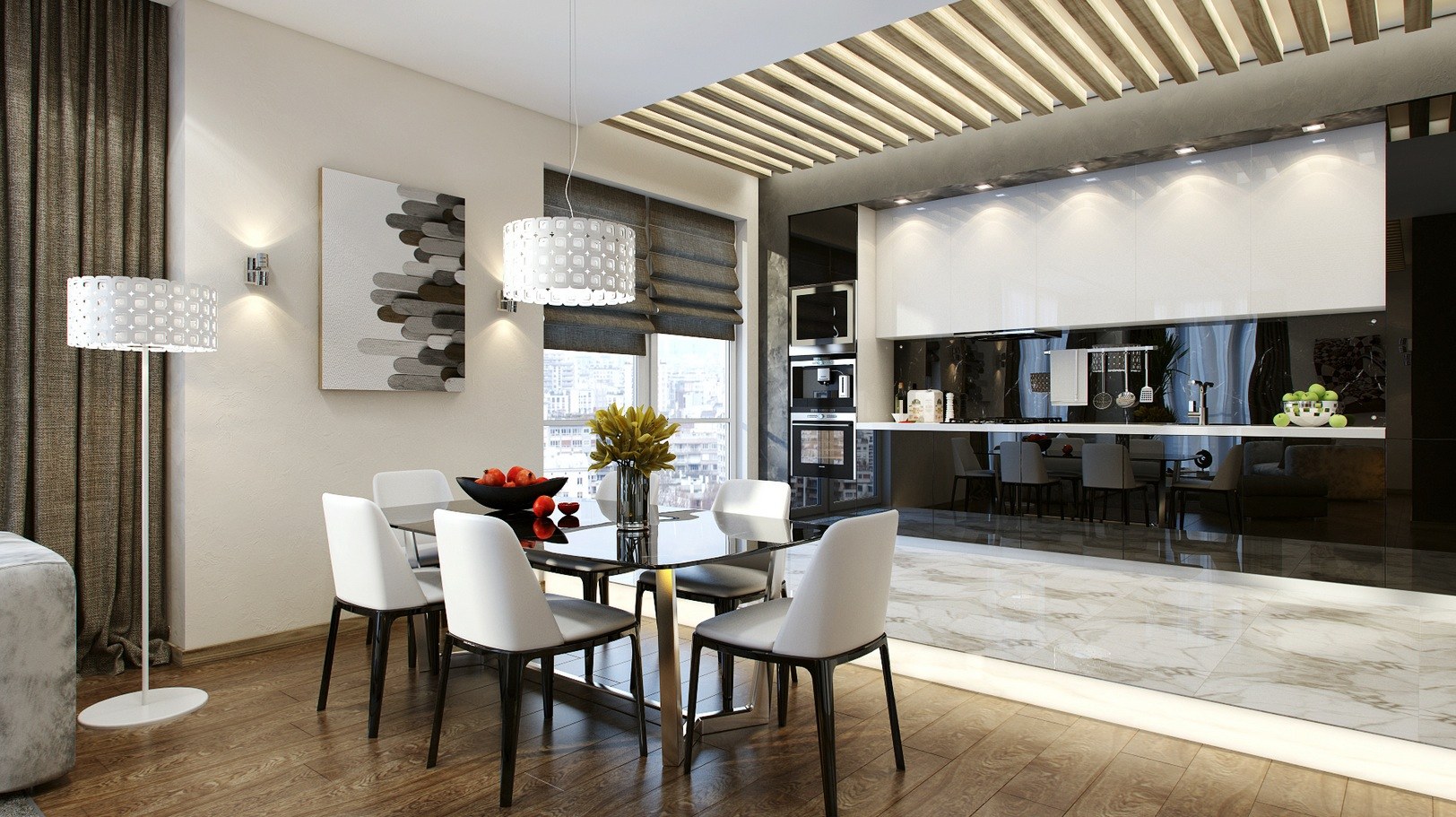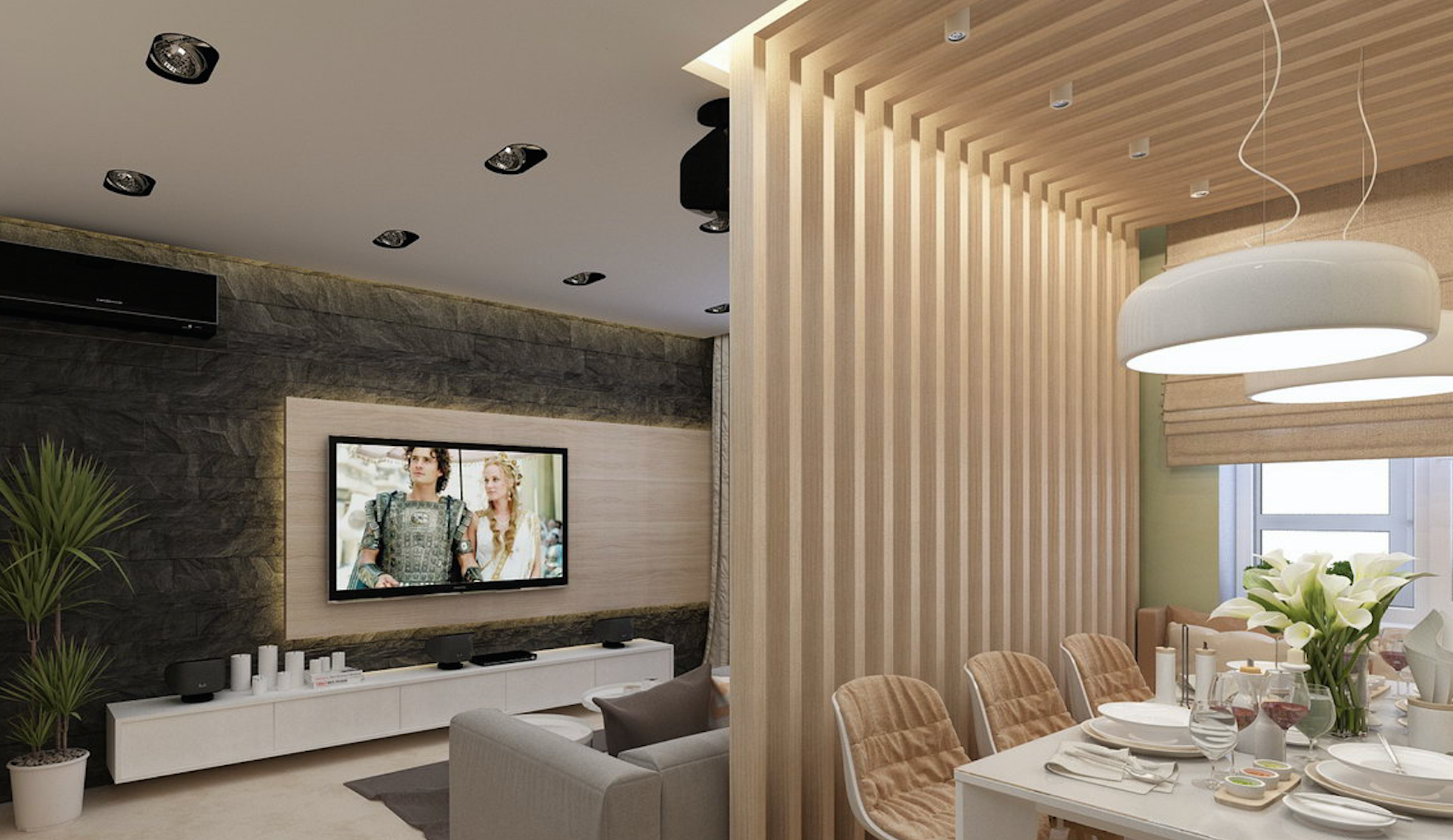 Кухня гостиная с реечной перегородкой