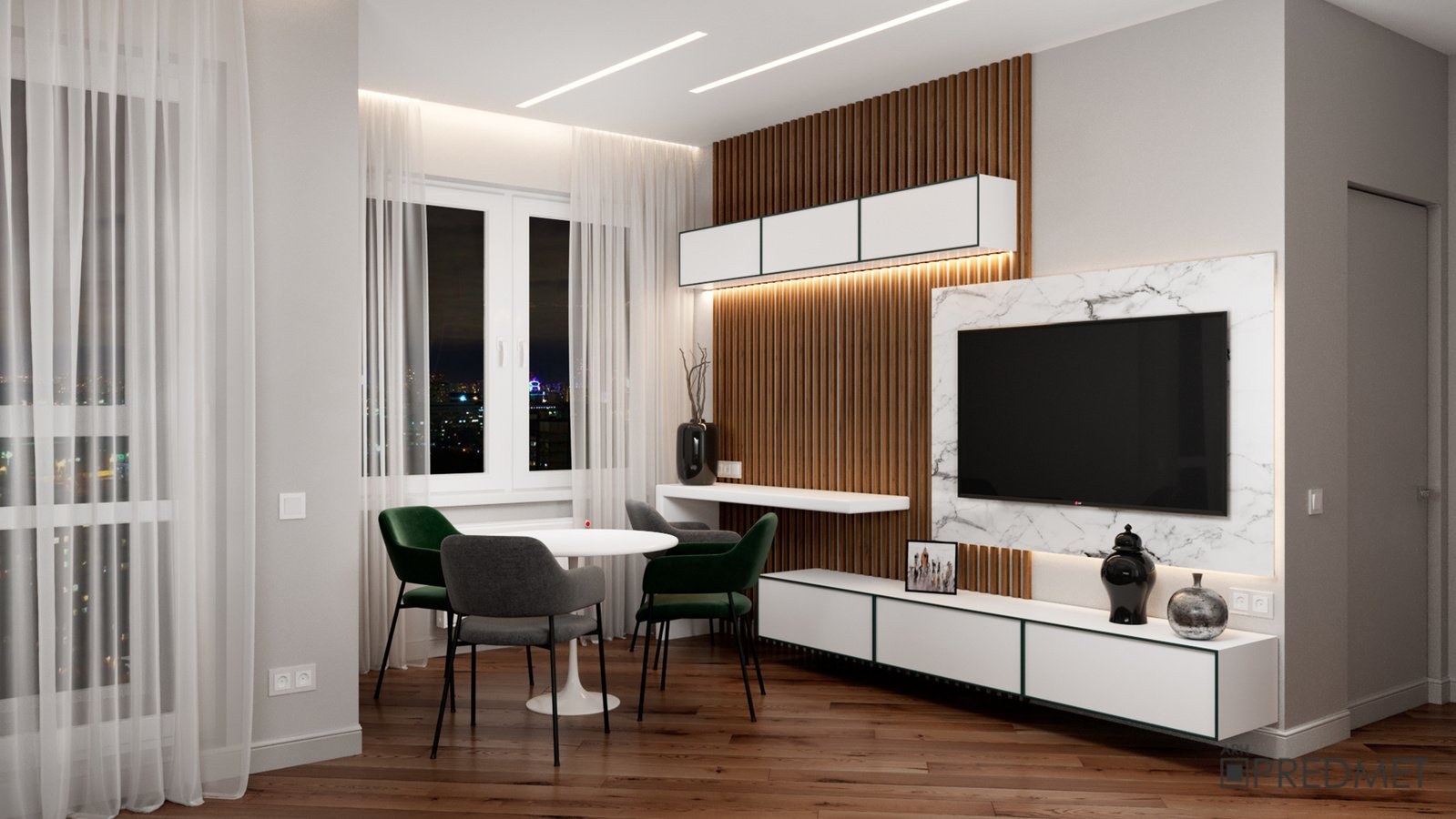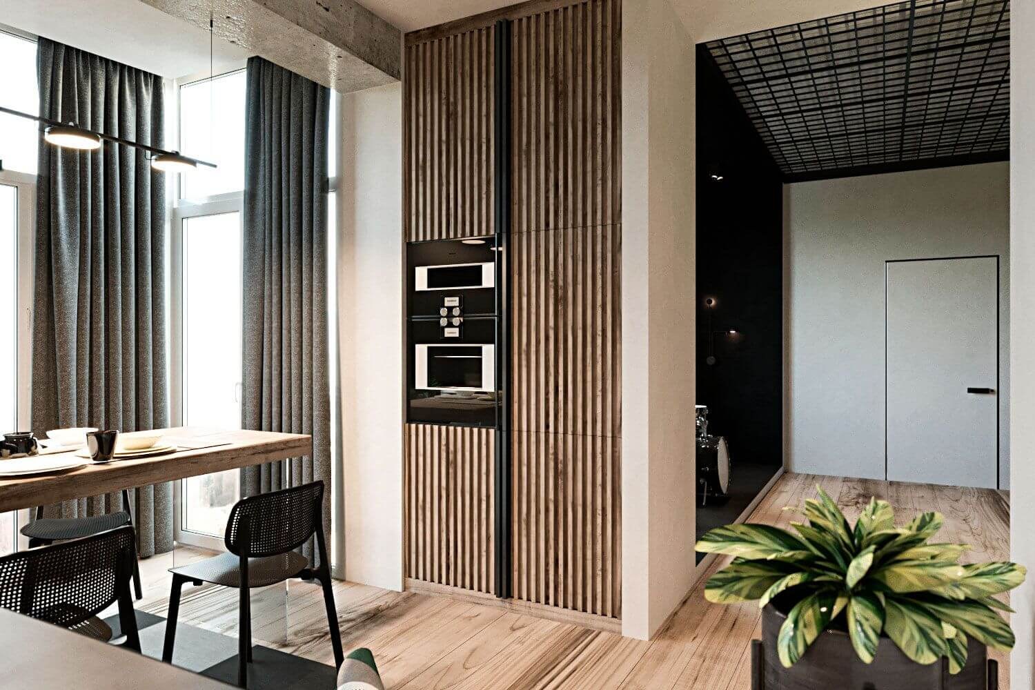 Кухня гостиная с рейками