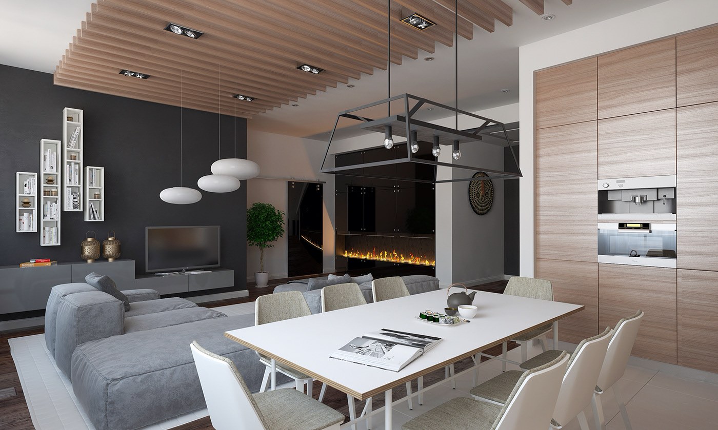Современная кухня гостиная с рейками дизайн (43 фото)