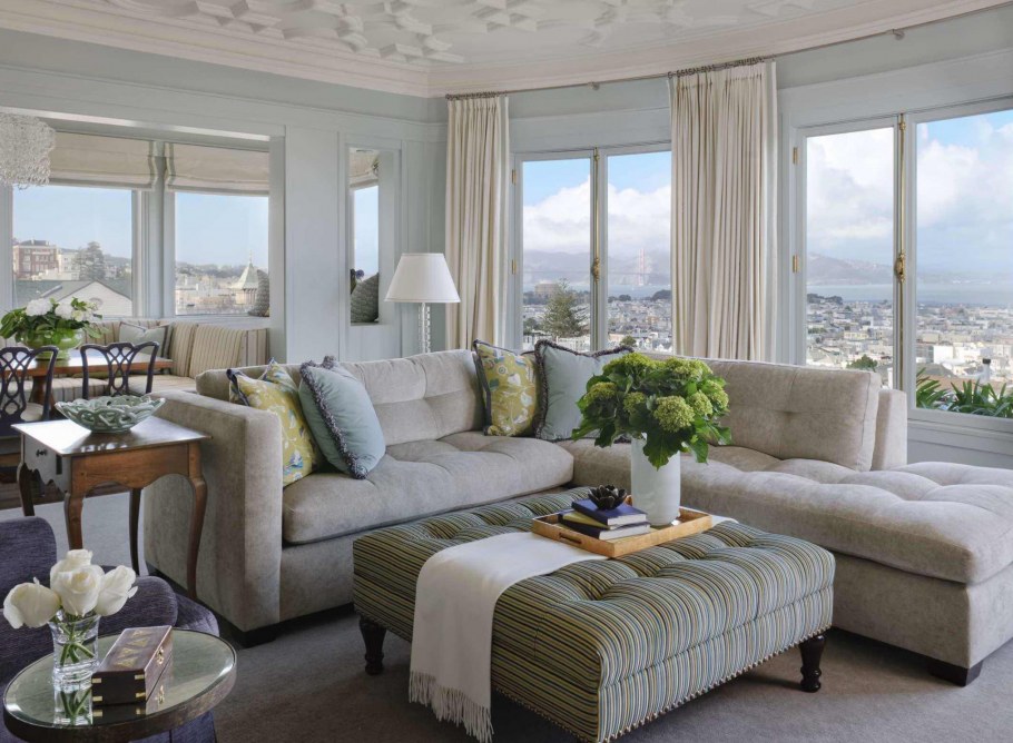 Диван спинкой к окну в гостиной в интерьере (54 фото)