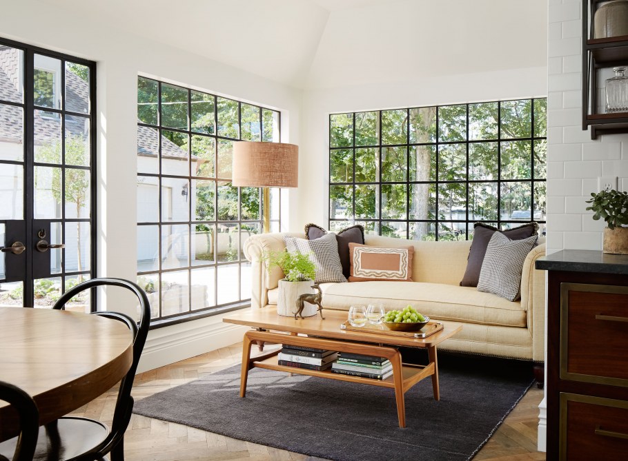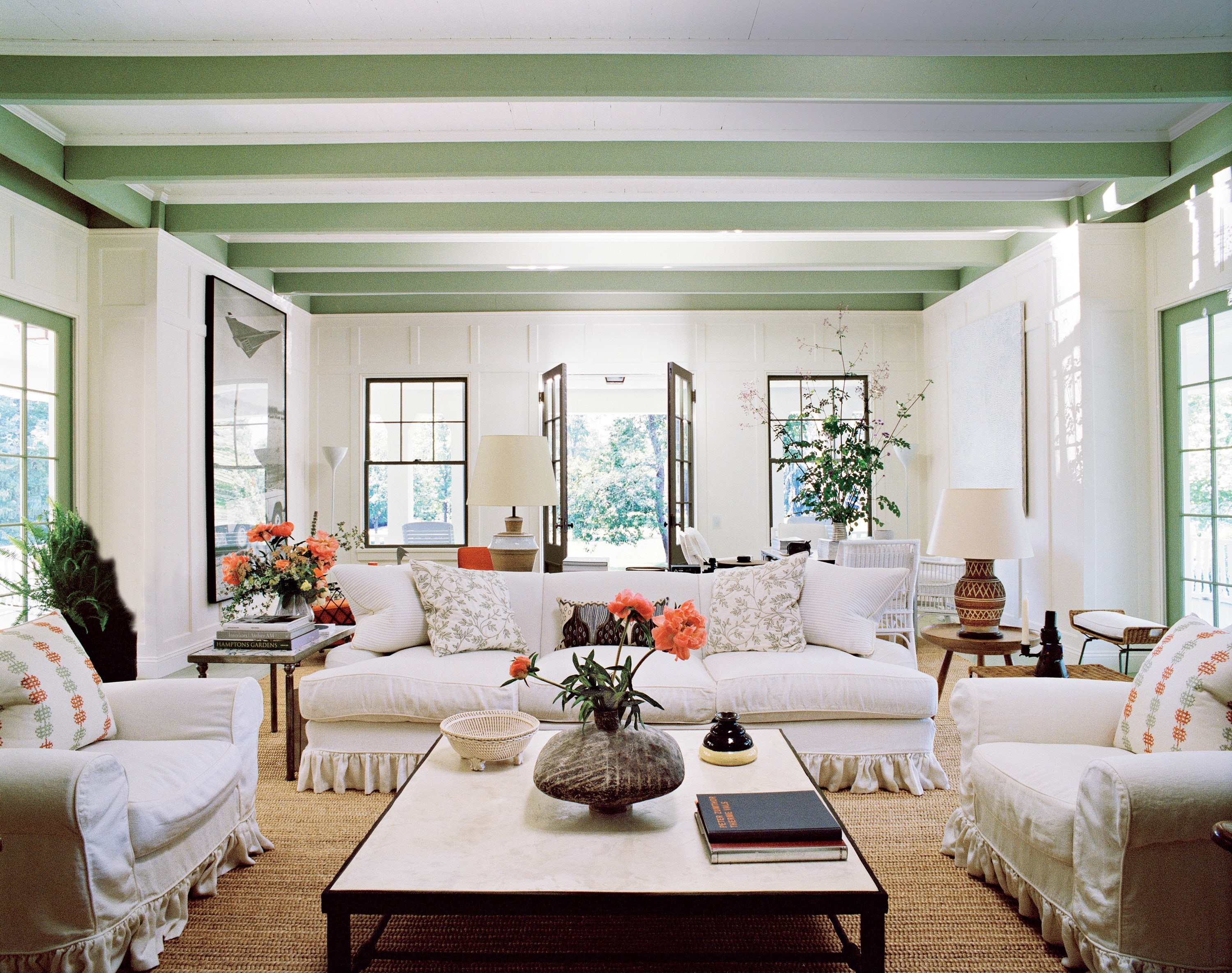 Белый интерьер с зелеными балками