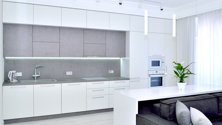 Белая кухня с серой столешницей