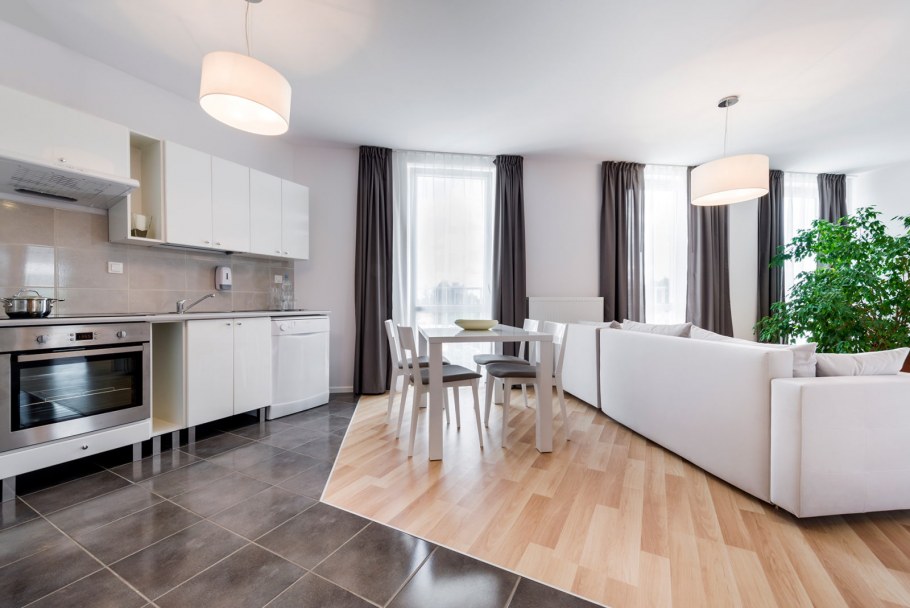 Зонирование кухни и гостиной плиткой и ламинатом