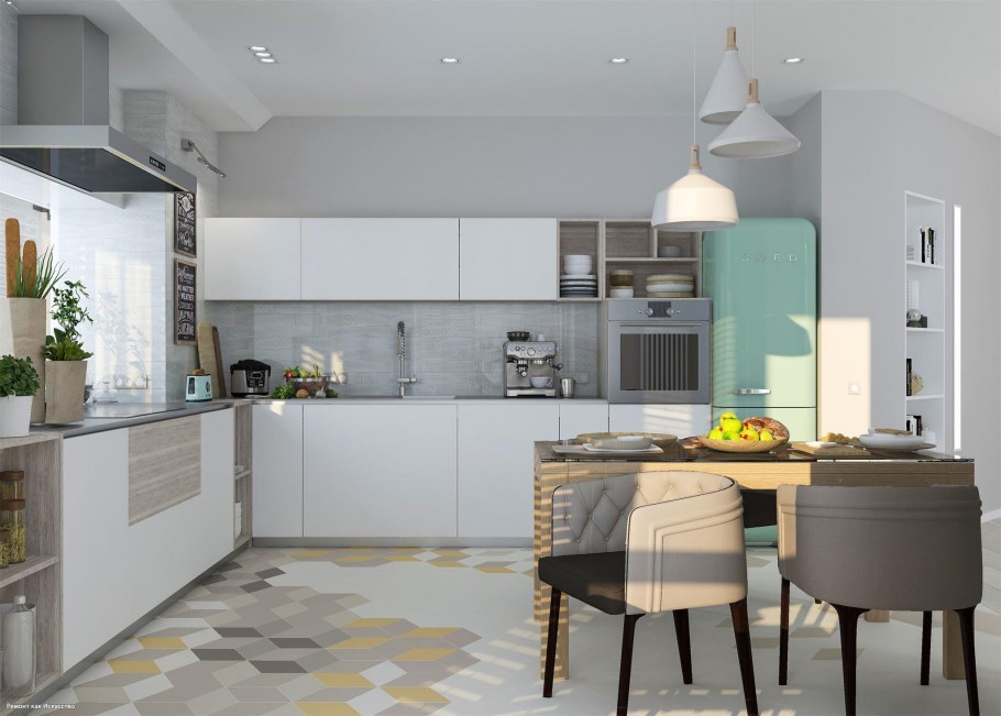Разделение зоны кухни и гостиной плиткой