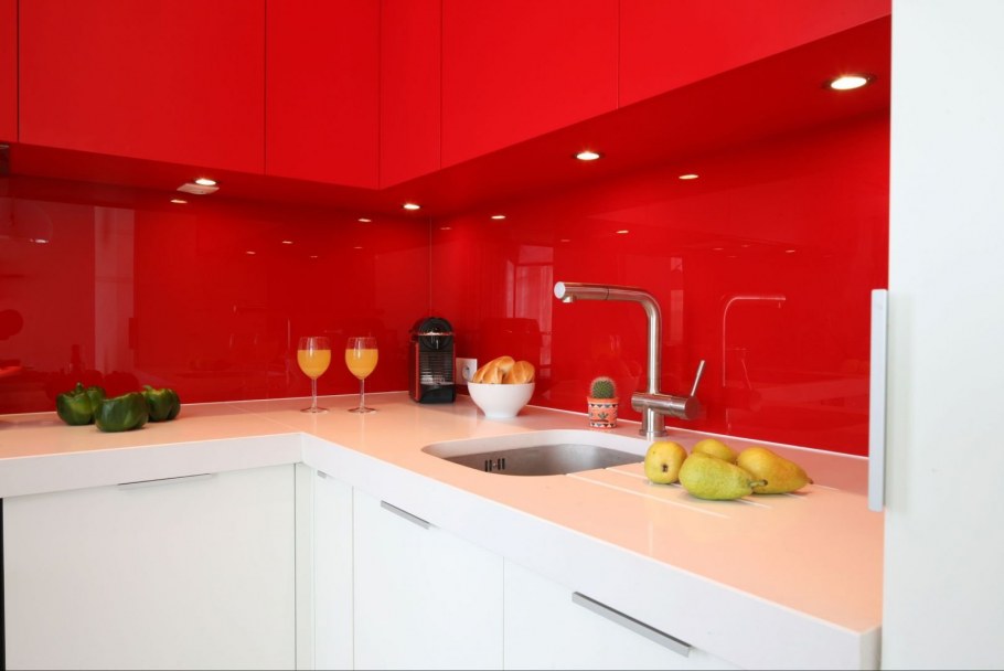 Красная кухня с черной столешницей и фартуком в интерьере (46 фото)