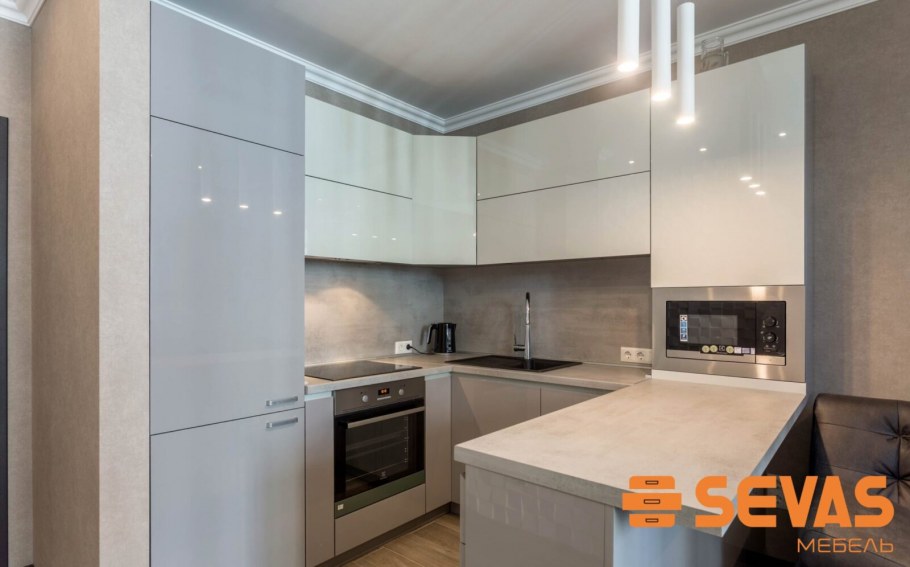Глянцевая кухня в современном стиле угловая под потолок (36 фото)