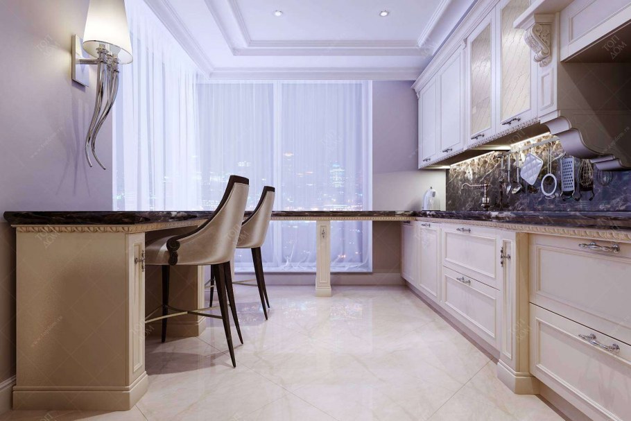 Белый мраморный пол в интерьере кухни