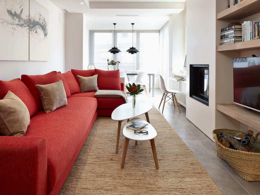 Красный диван в интерьере гостиной