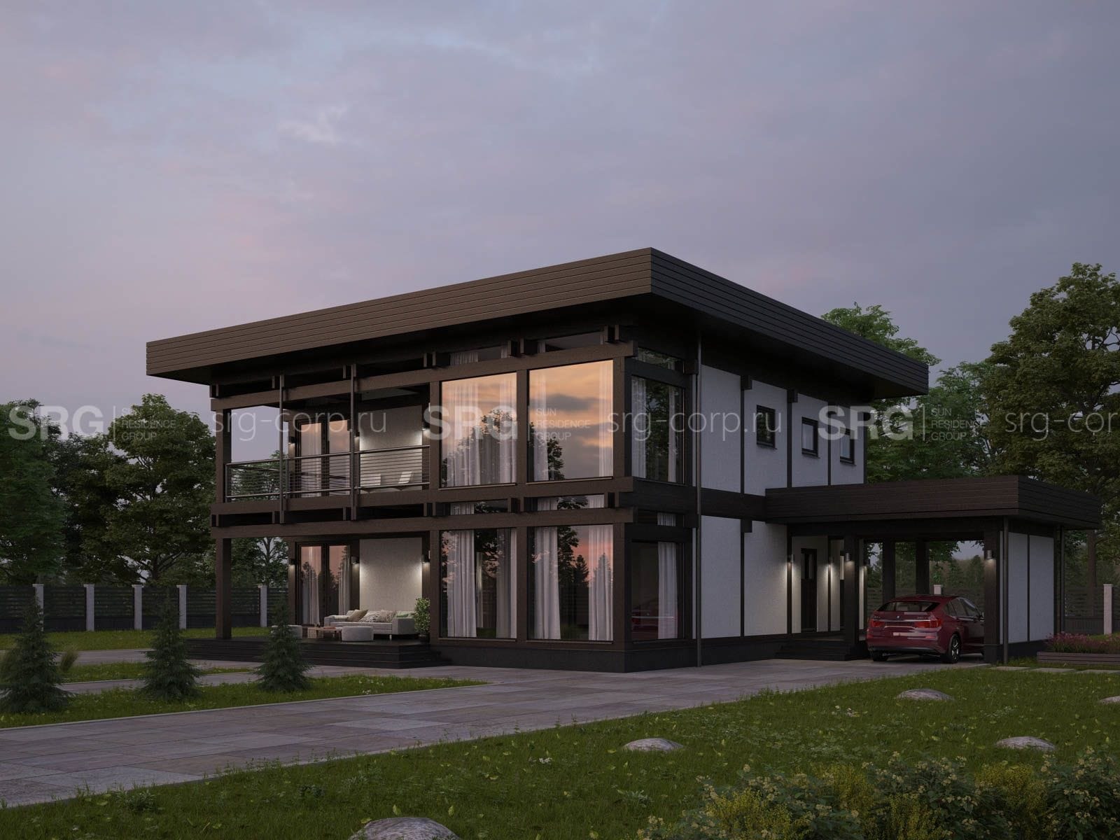 Дом с плоской крышей и панорамными окнами одноэтажный