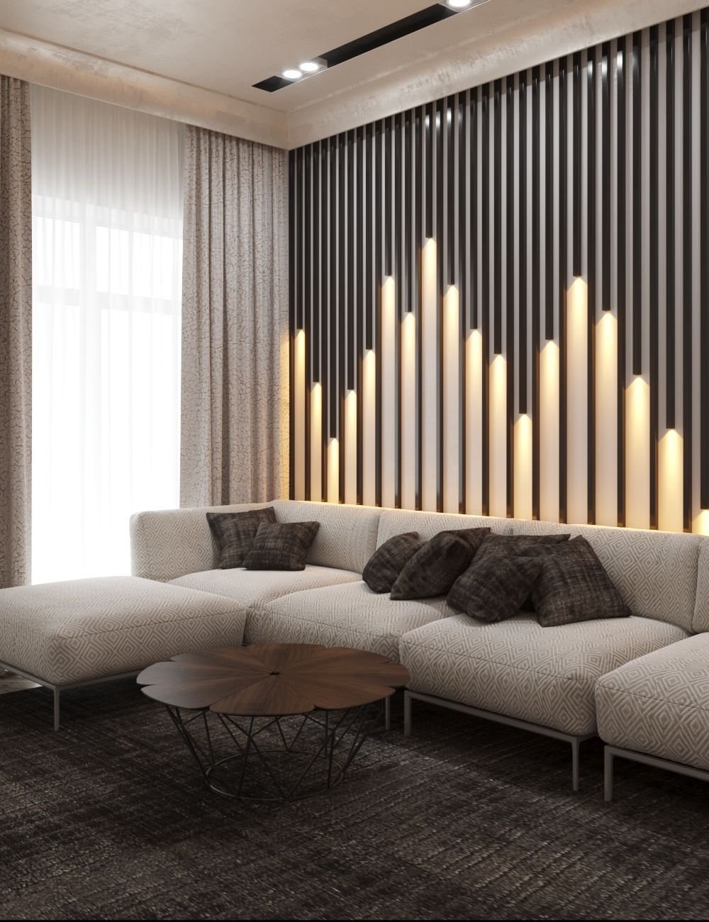 Реечная стена в интерьере гостиной