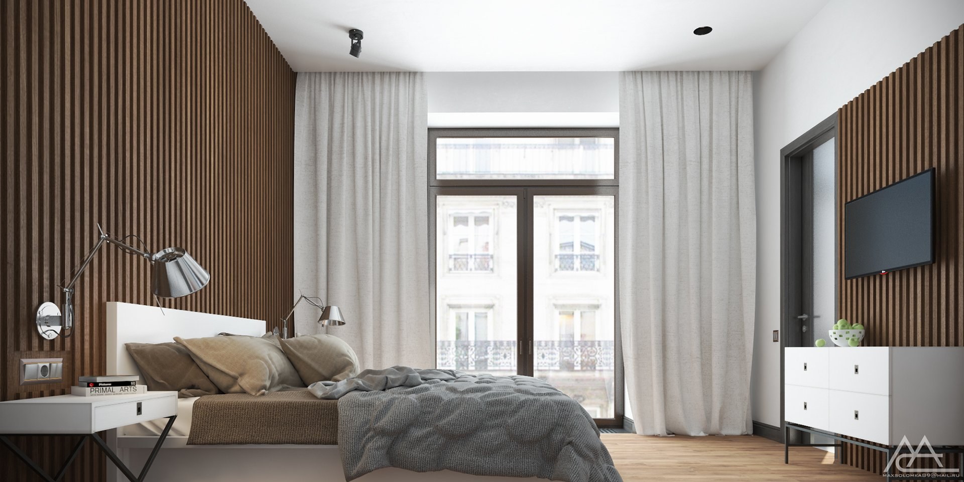 Интерьер спальни с деревянными ламелями