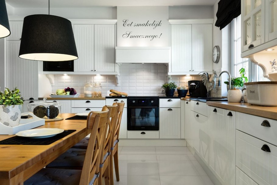 Белая кухня с черной раковиной и деревянной столешницей (39 фото)