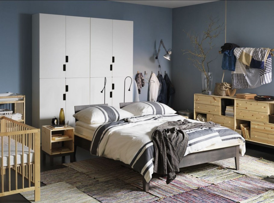 Деревянной икеевской кровати в интерьере спальни