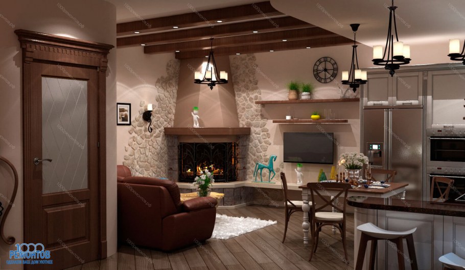 Кухня и гостиная с камином таунхаус