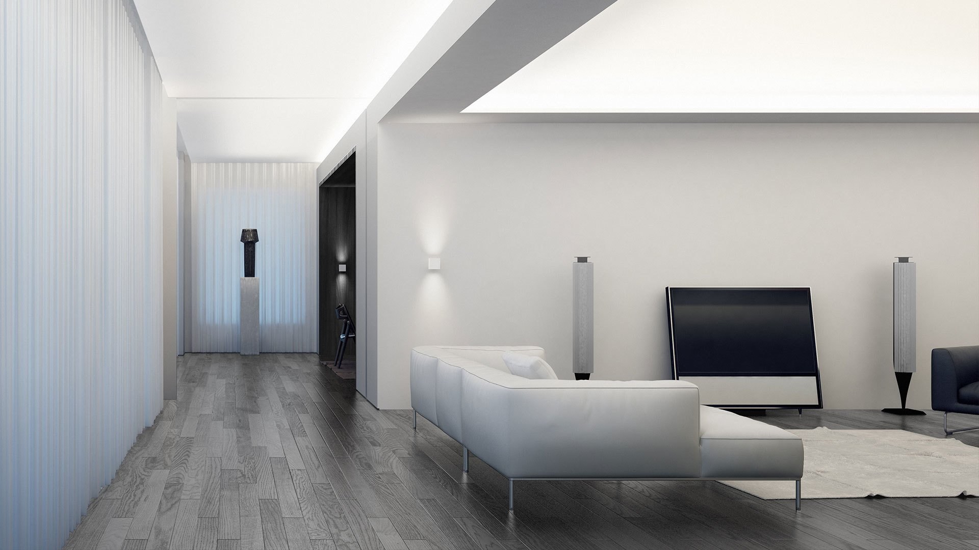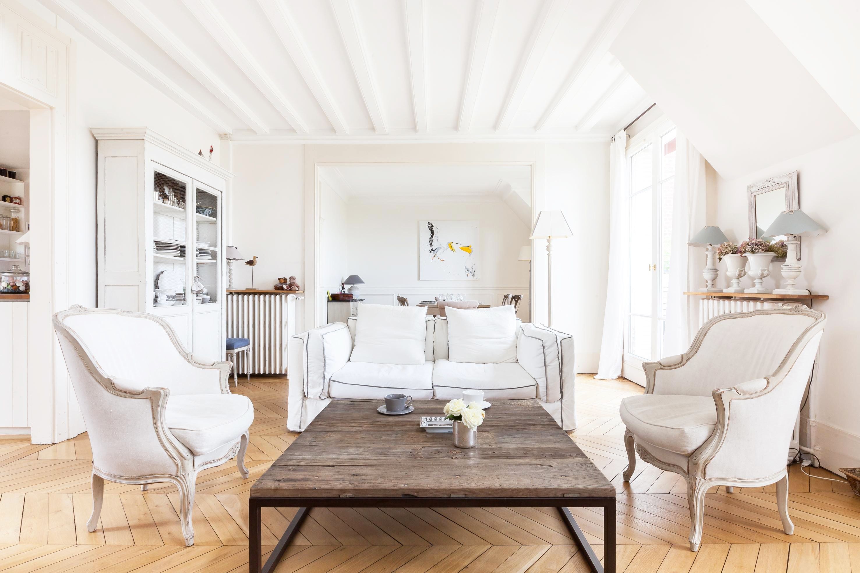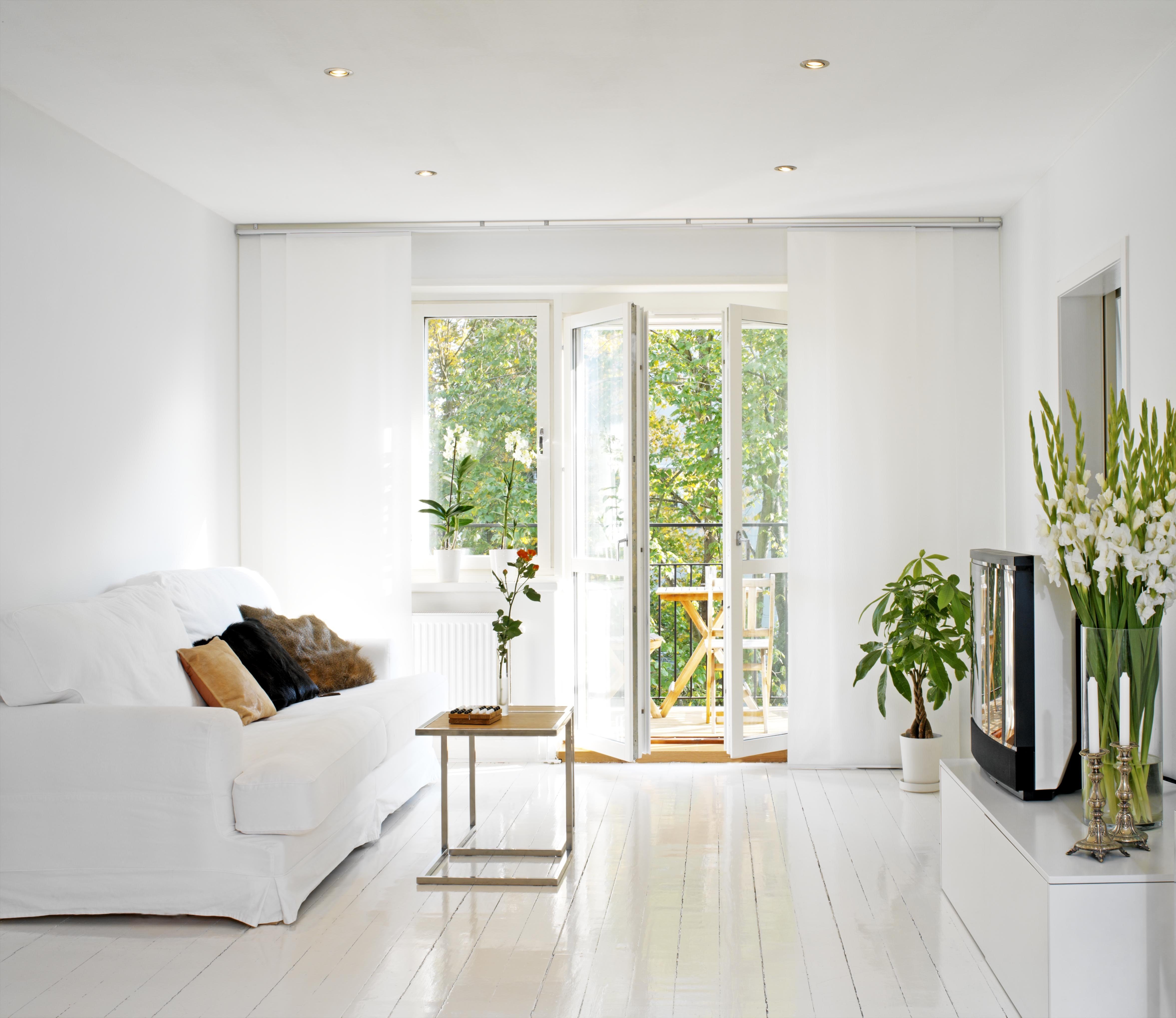 Интерьер гостиной с белыми стенами и деревянным полом