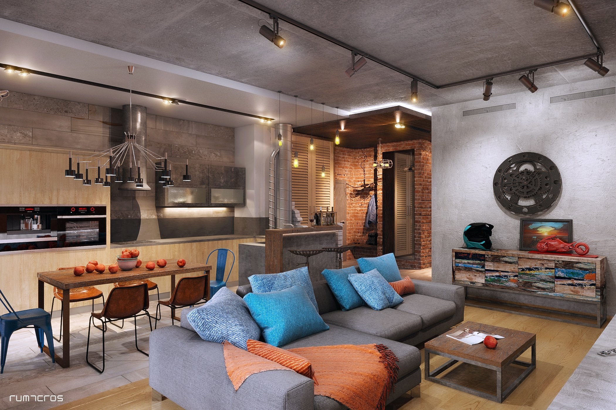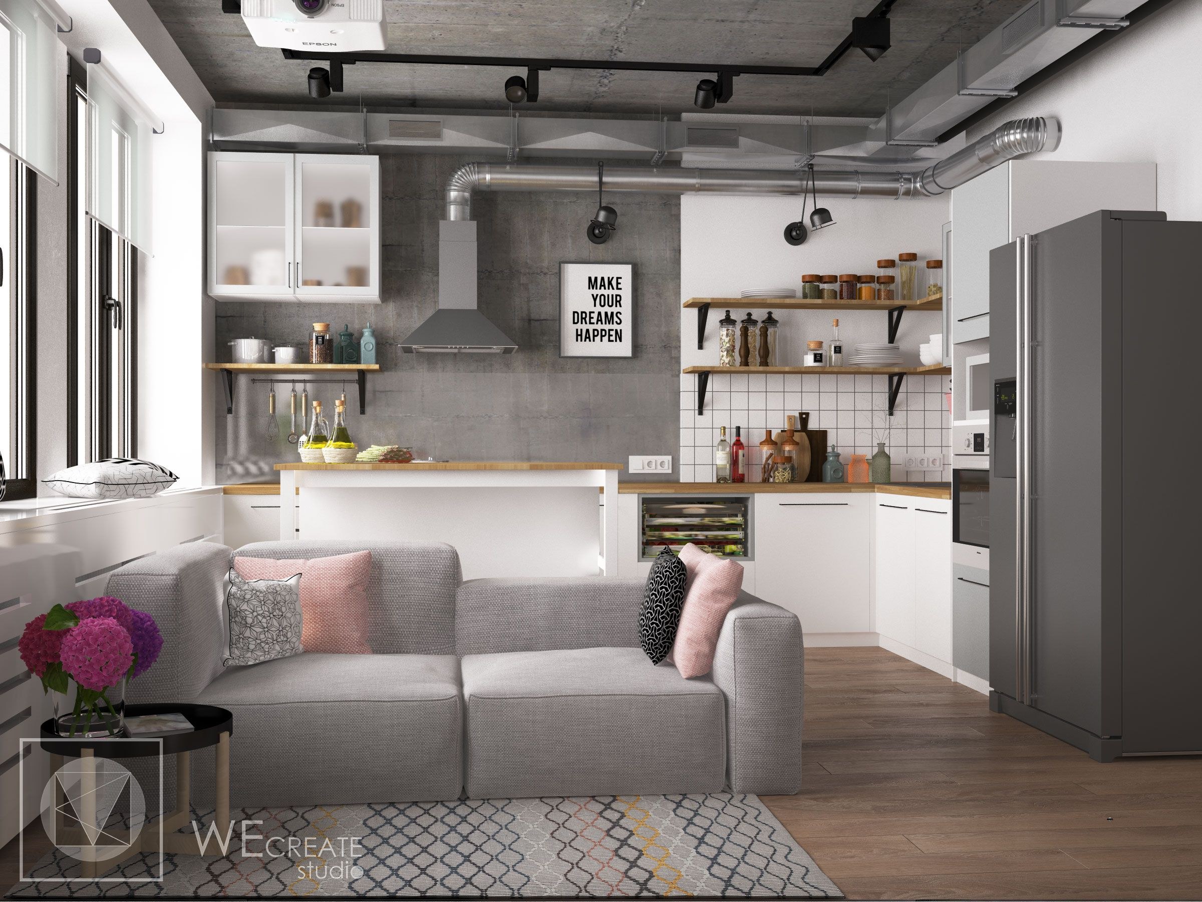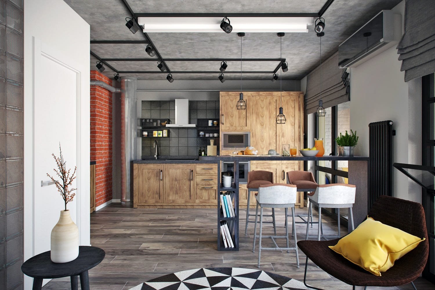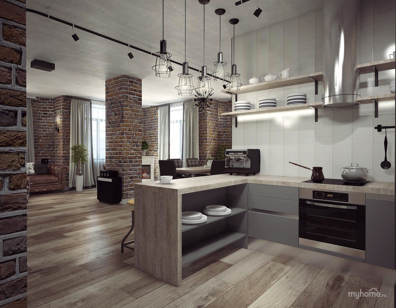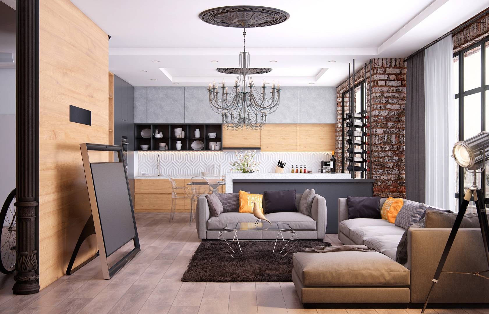 Кухня гостиная в стиле лофт светлая (47 фото)