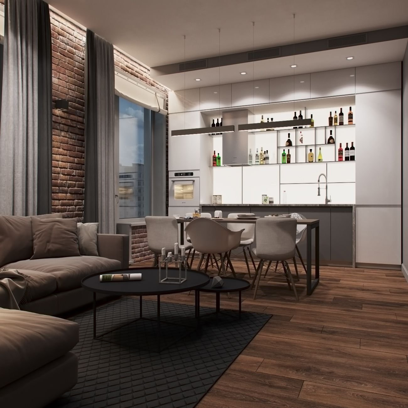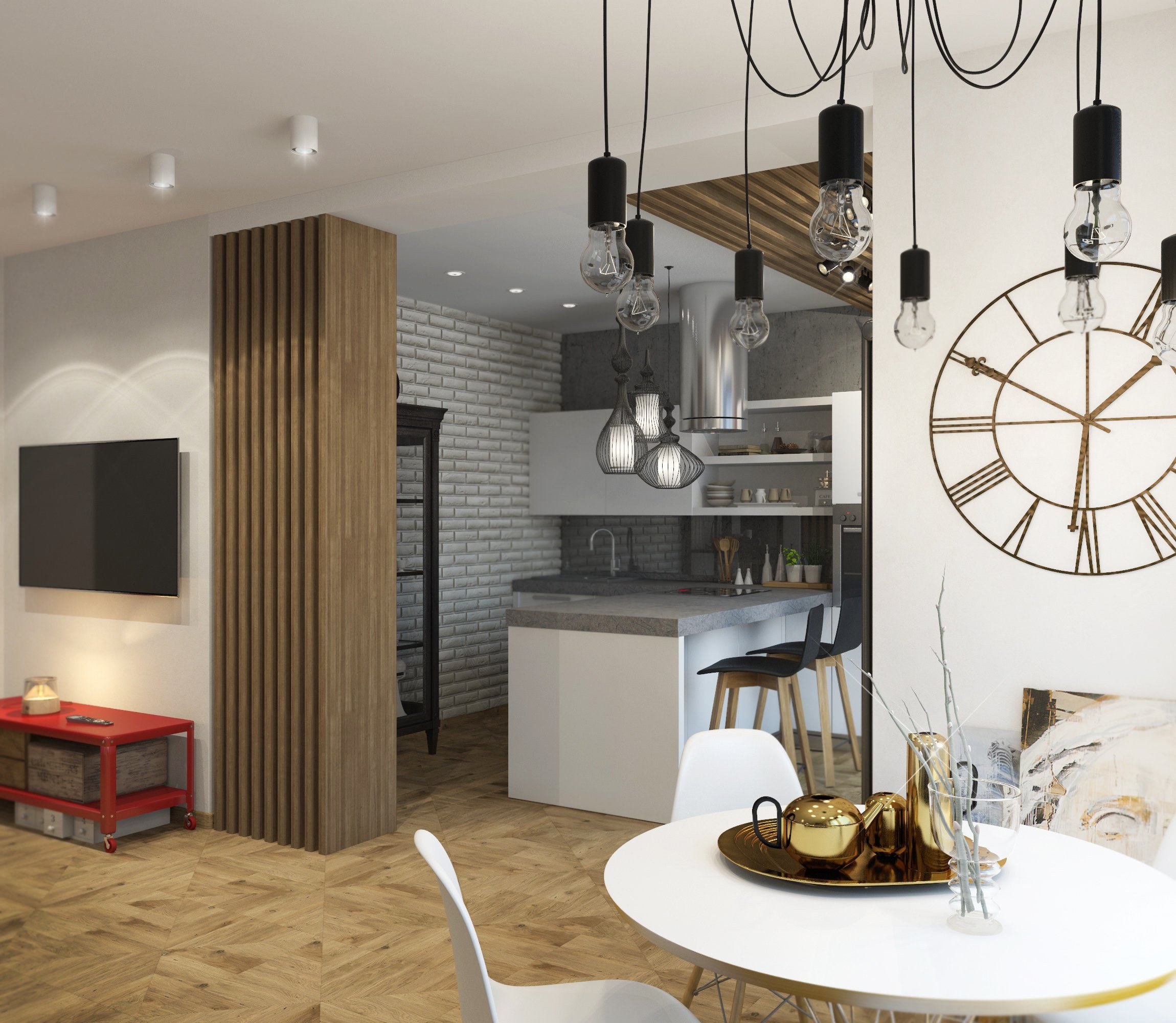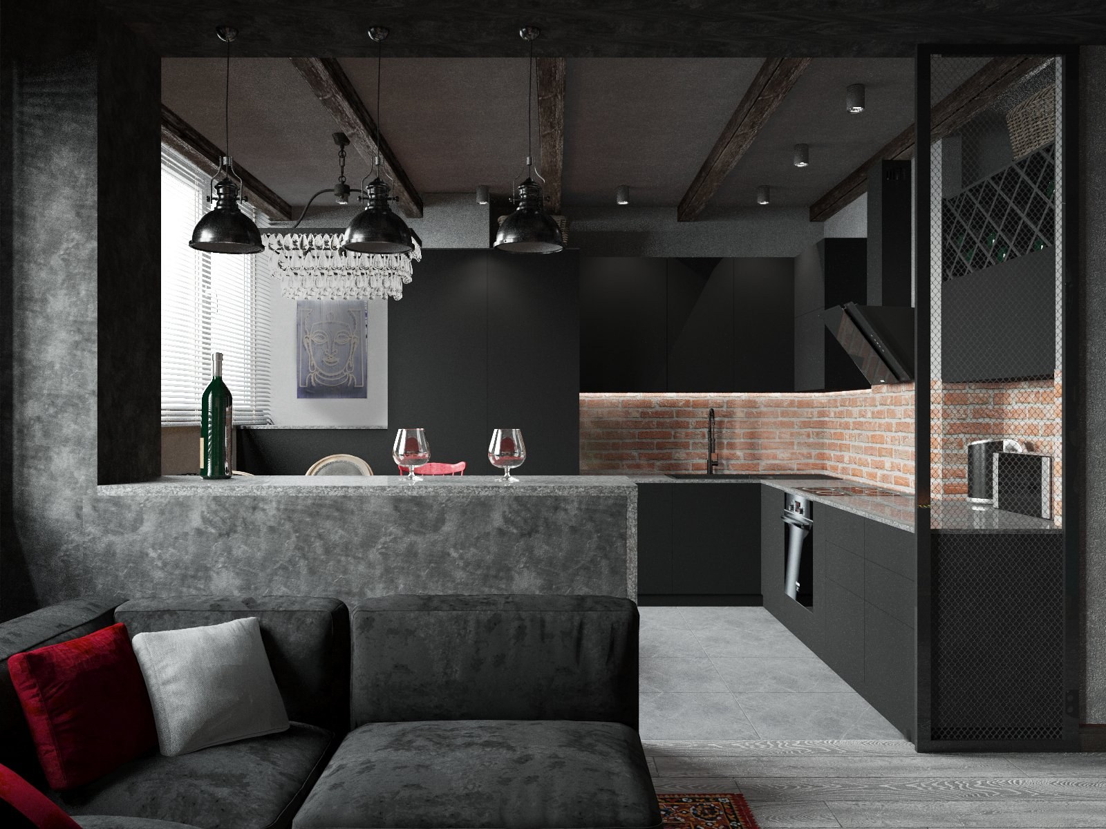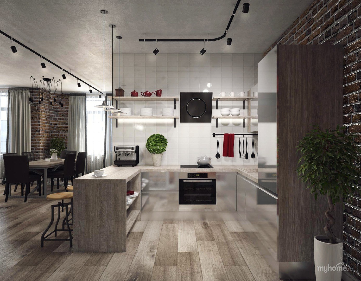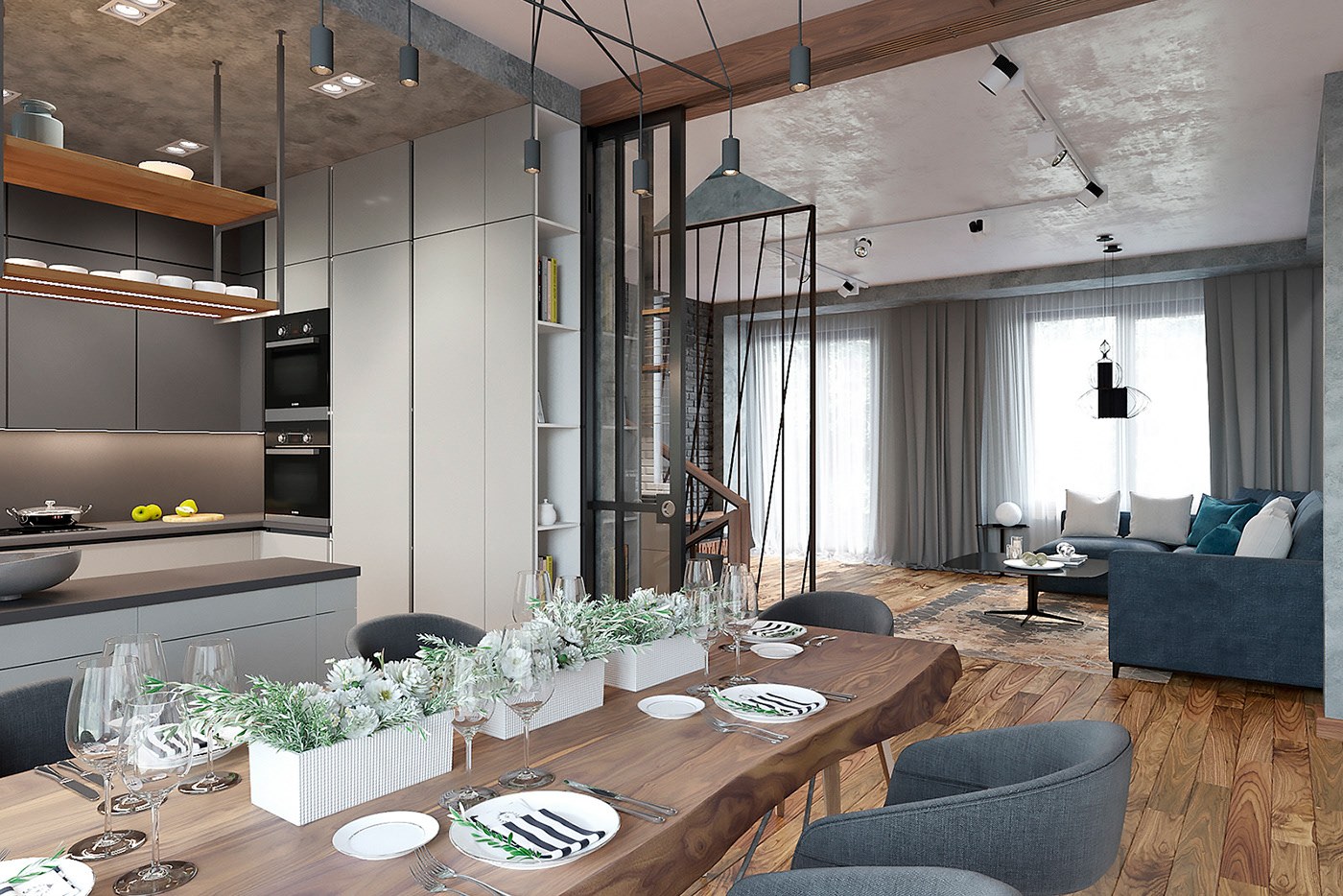 Кухня гостиная в стиле лофт светлая (47 фото)