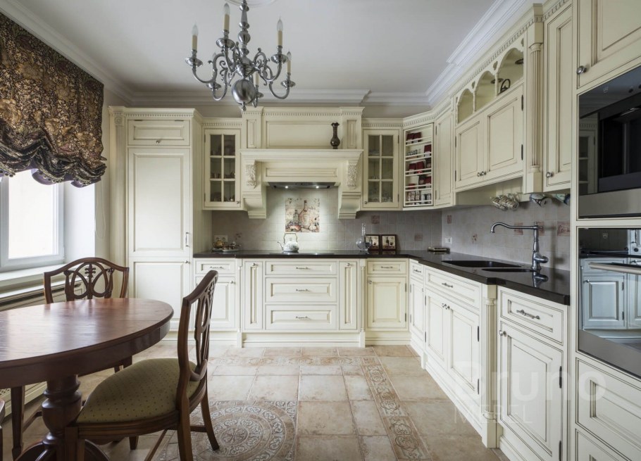Кухня гостиная в неоклассическом стиле в светлых тонах