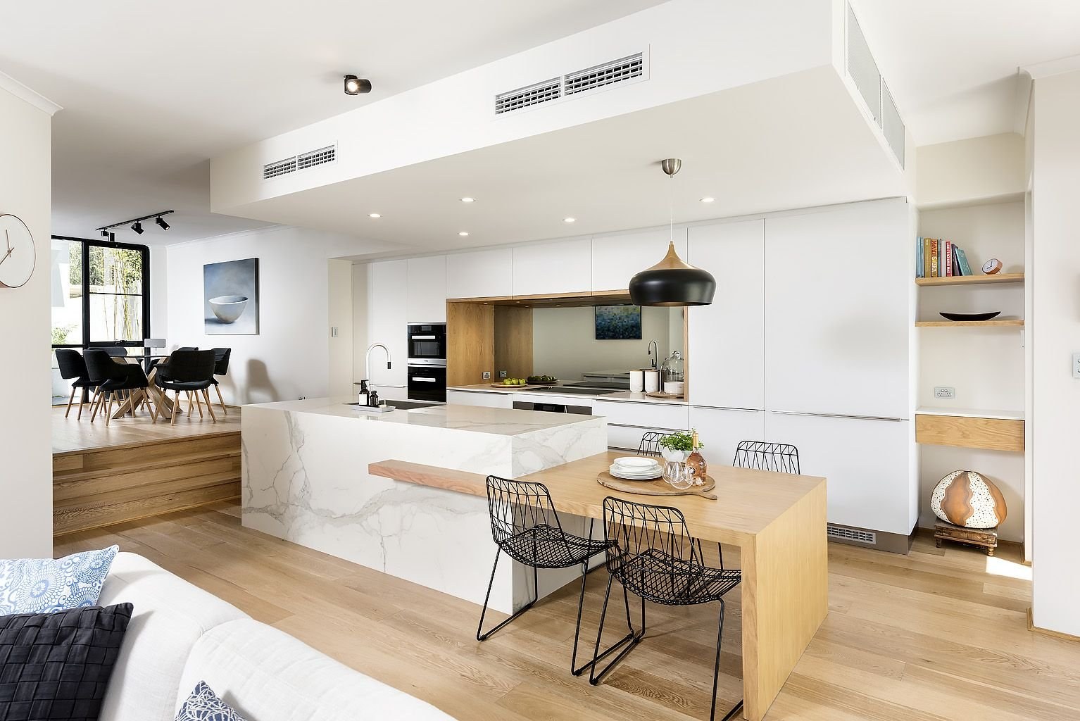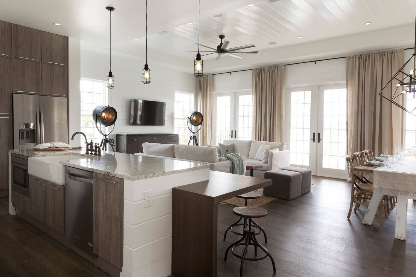 Современные интерьеры кухни совмещенной с гостиной