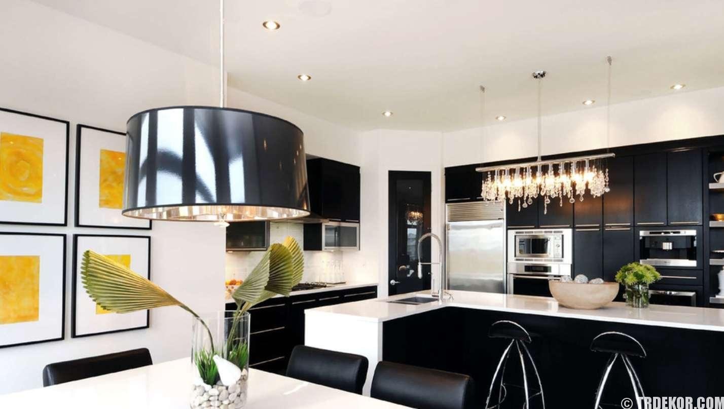 Черная люстра на белой кухне