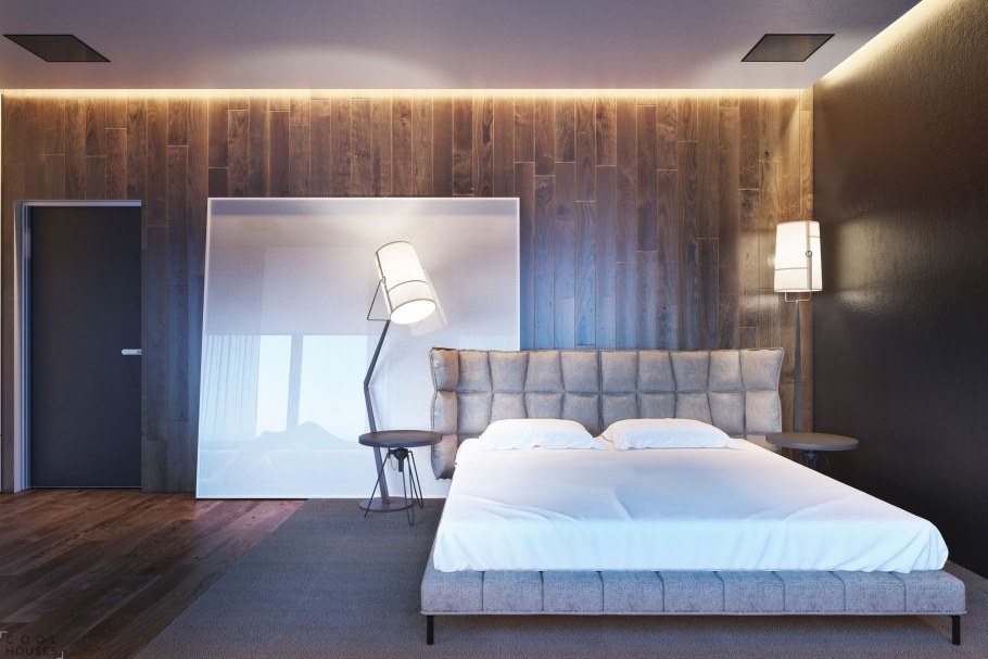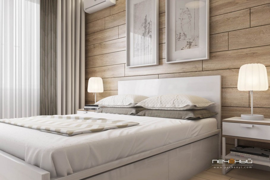 Дизайн спальни 12 кв.м с ламинатом на стене