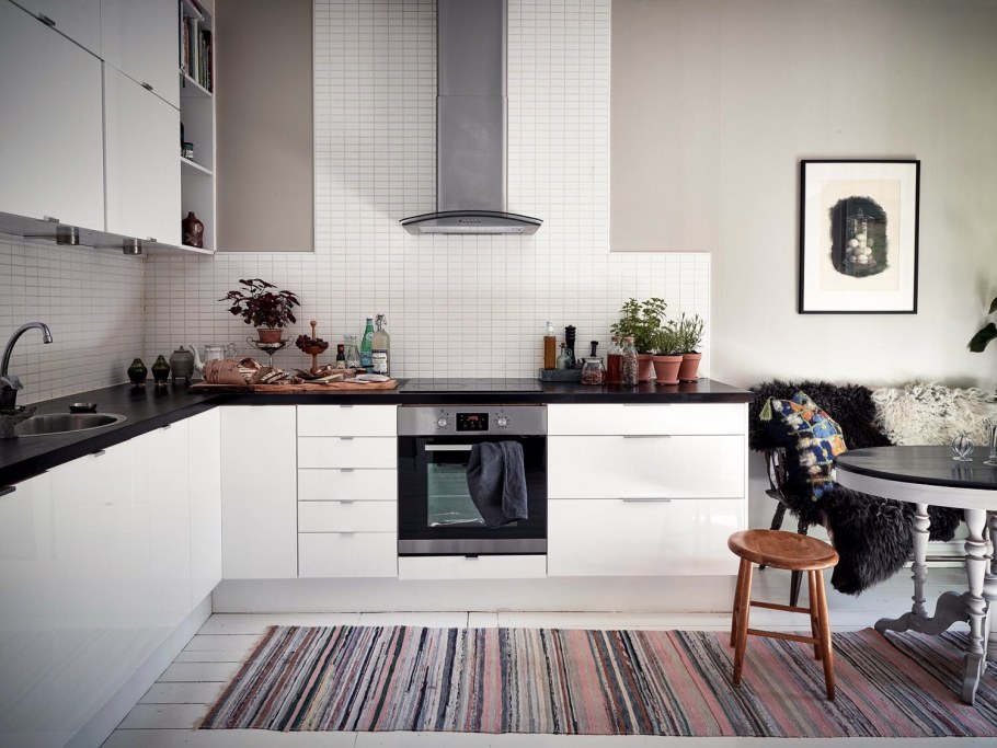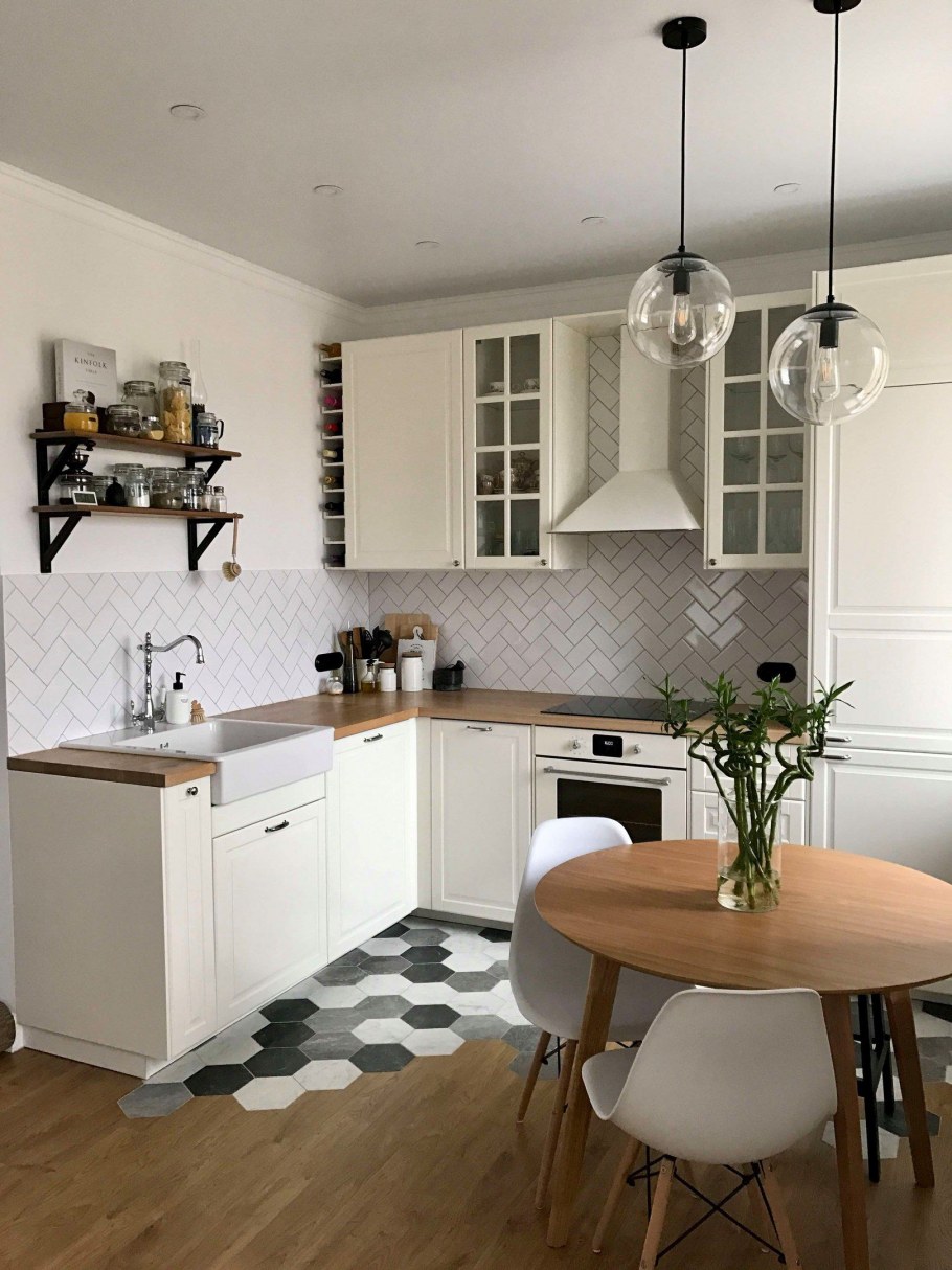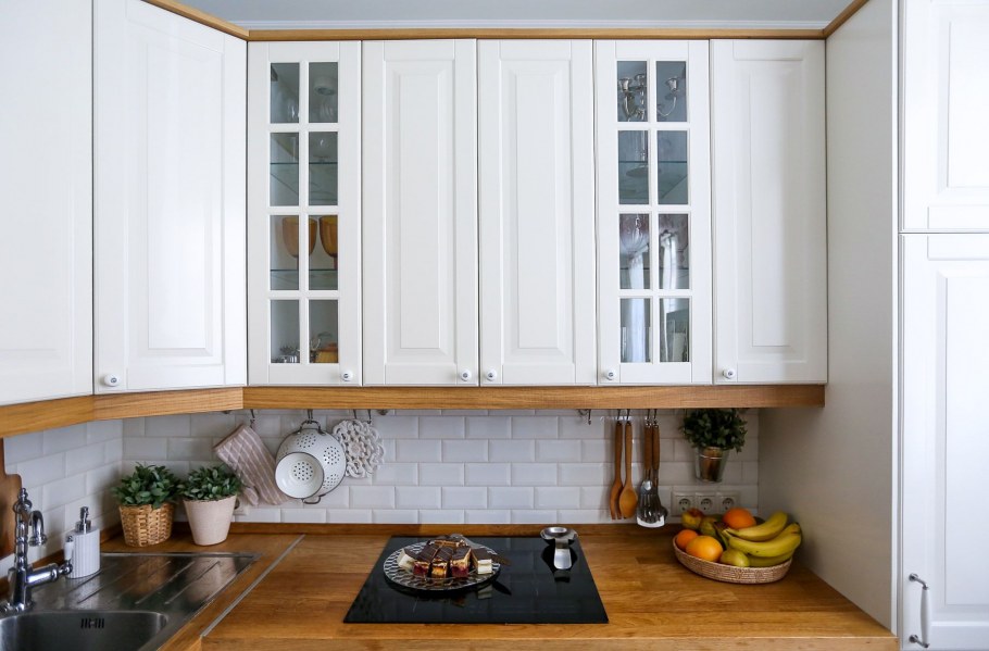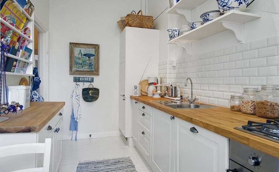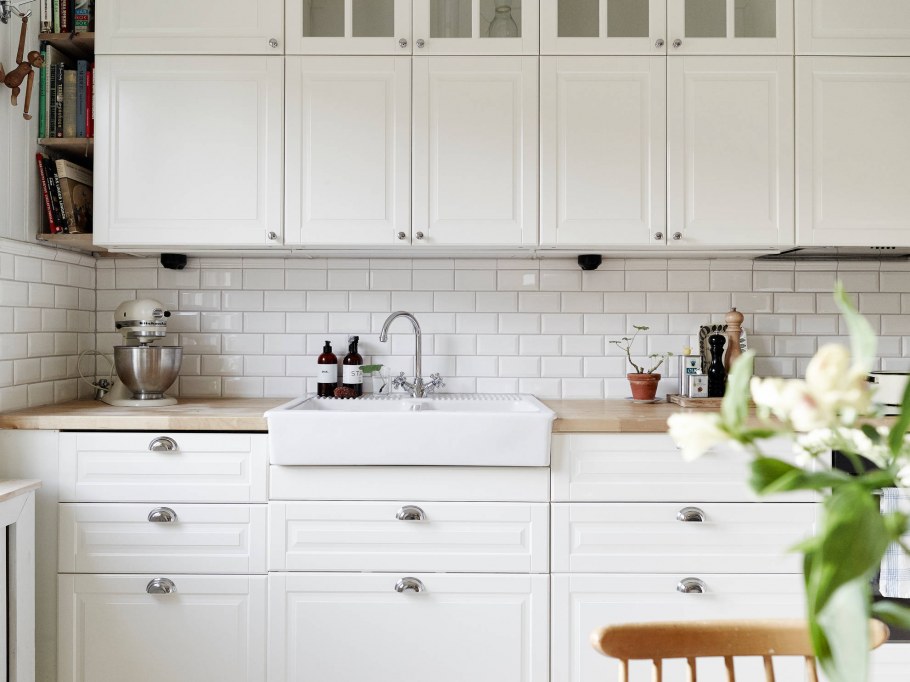 Белая кухня с деревянной столешницей в скандинавском стиле