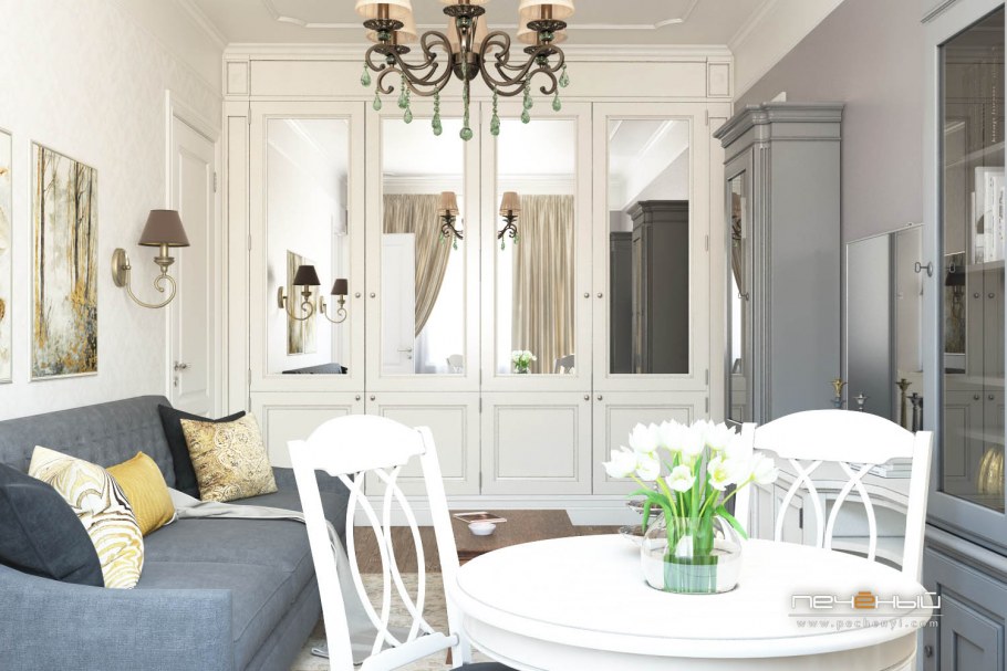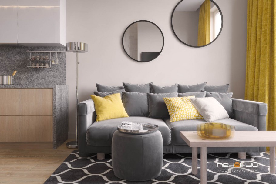Интерьер гостиной в квартире 18 кв.м в современном стиле в сером цвете