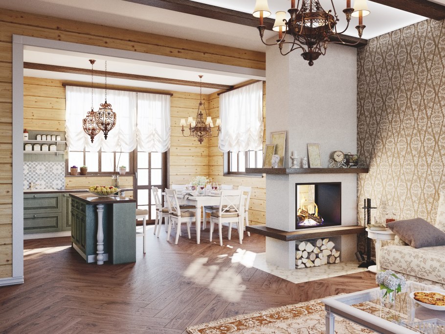 Кухня-гостиная в стиле Прованс в деревянном доме