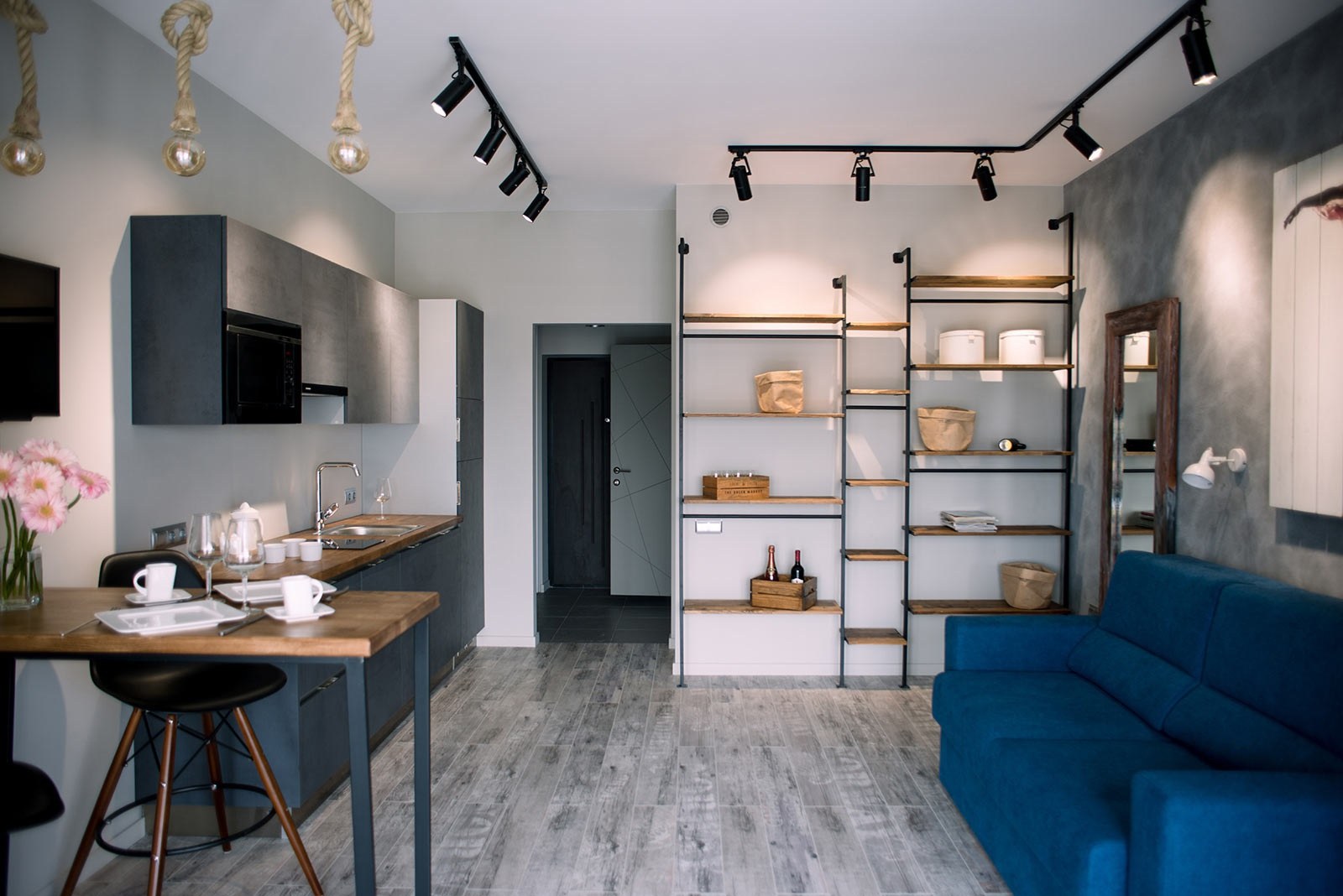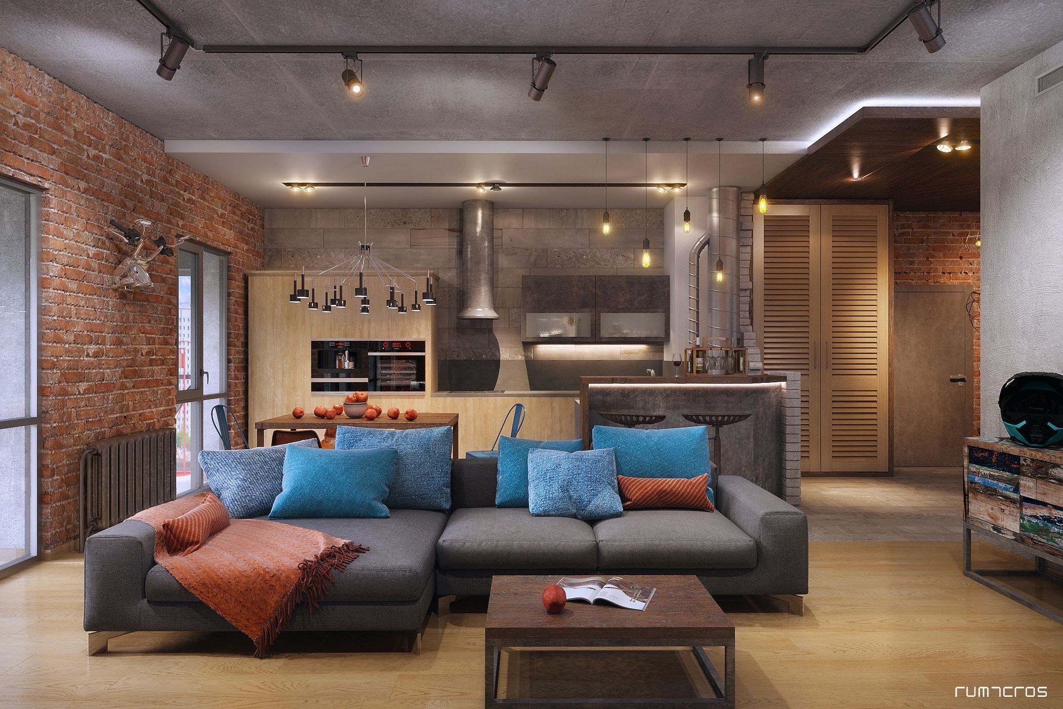 Интерьер кухня-гостиная лофт 20 кв
