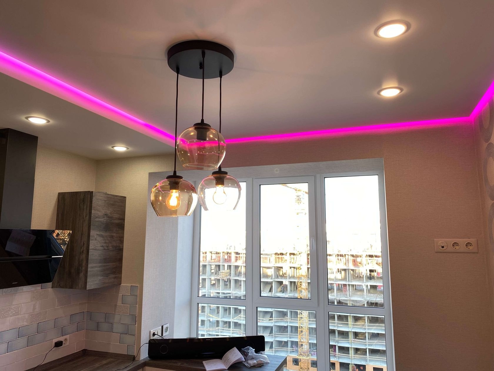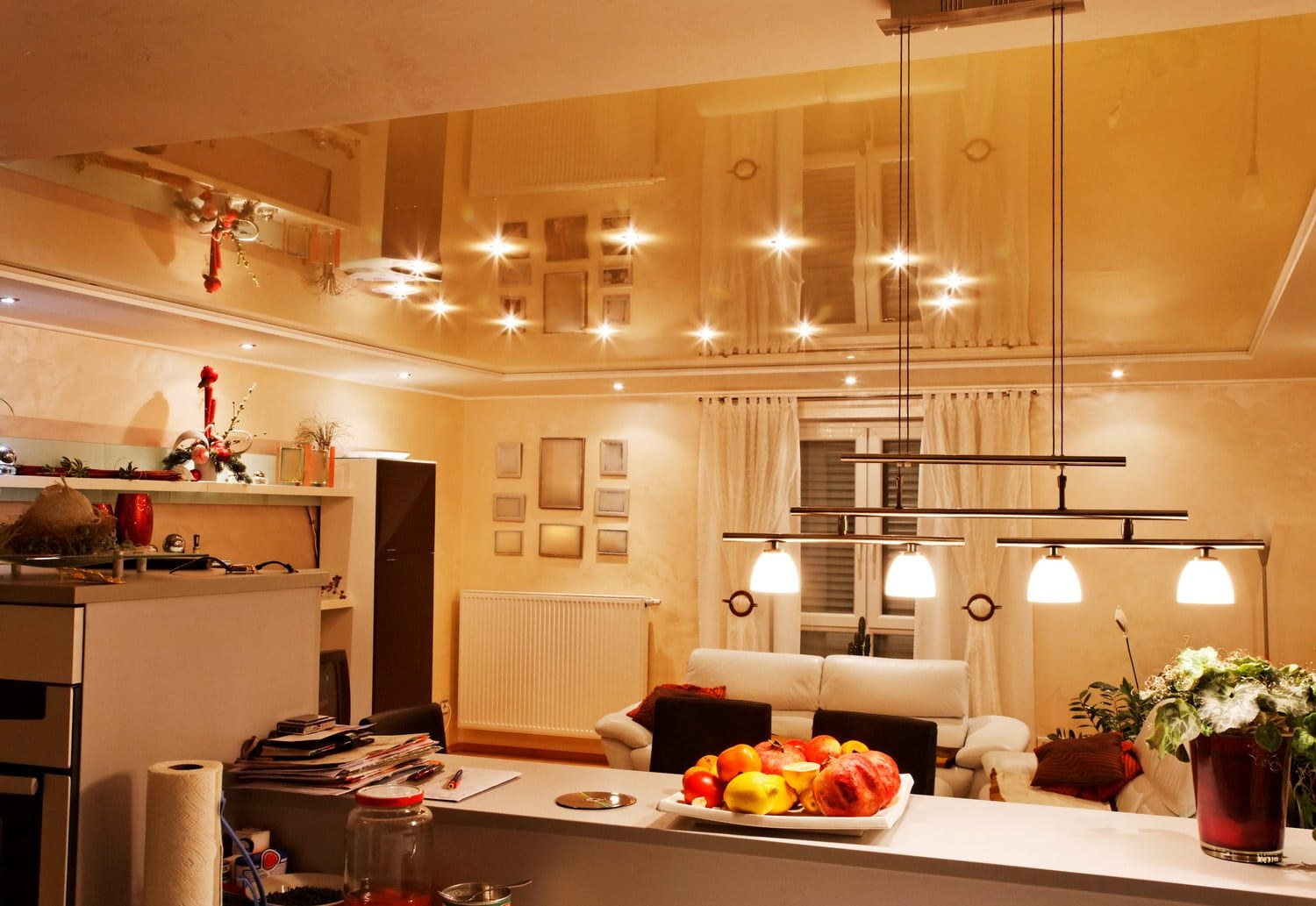 Светильники точечные потолочные в интерьере на кухне-гостиной