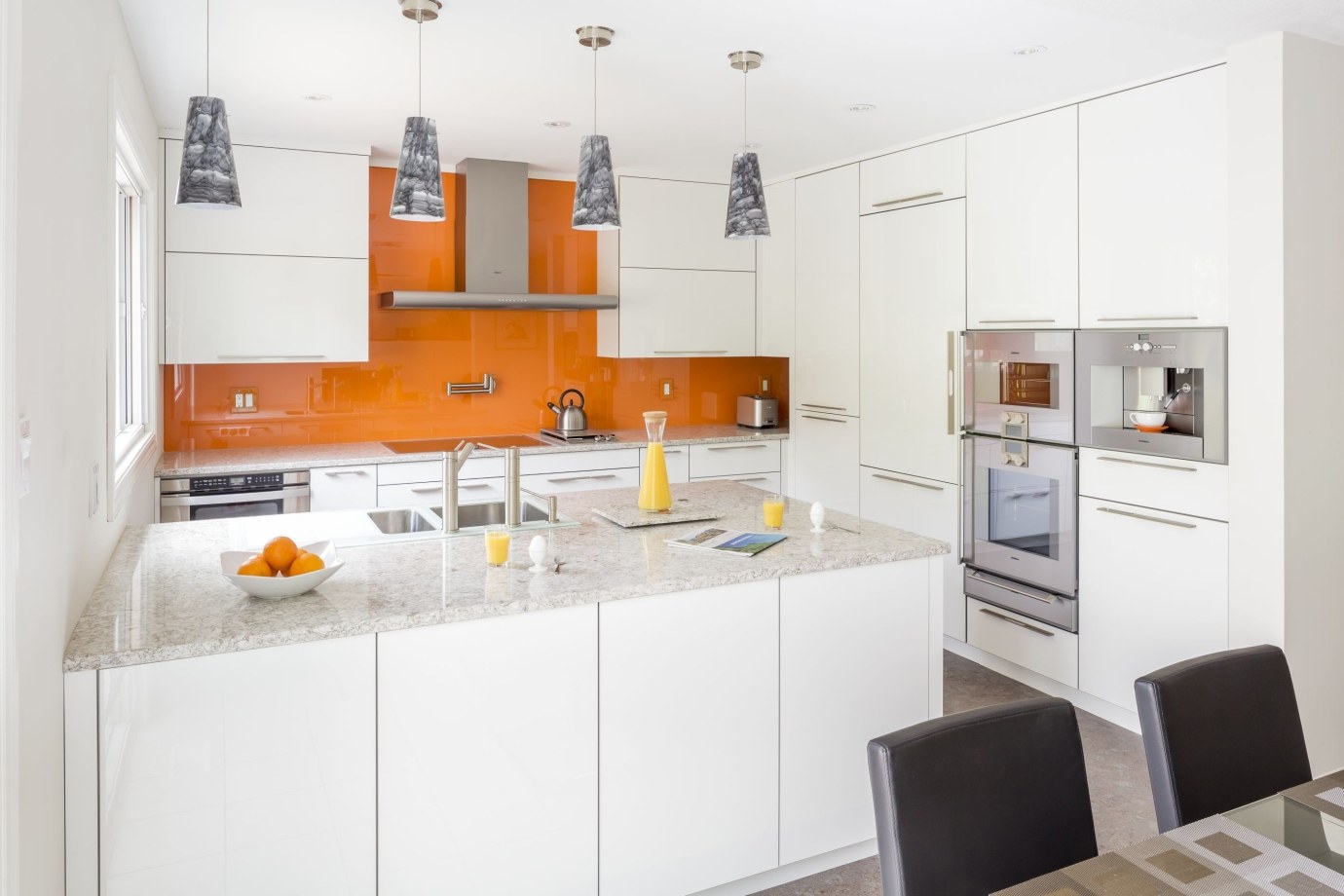 Белая кухня с оранжевым фартуком