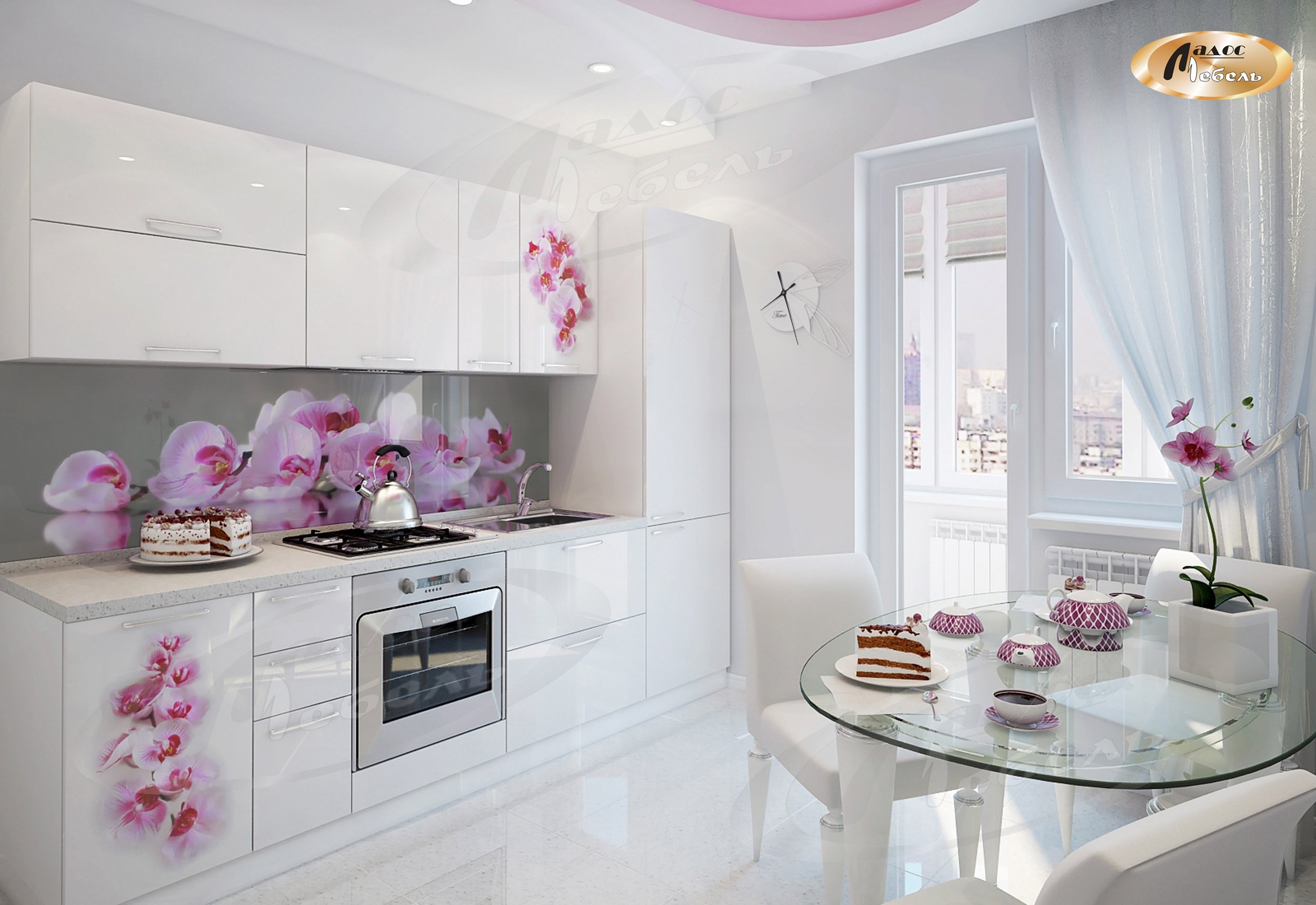 Белая кухня с розовым перламутром