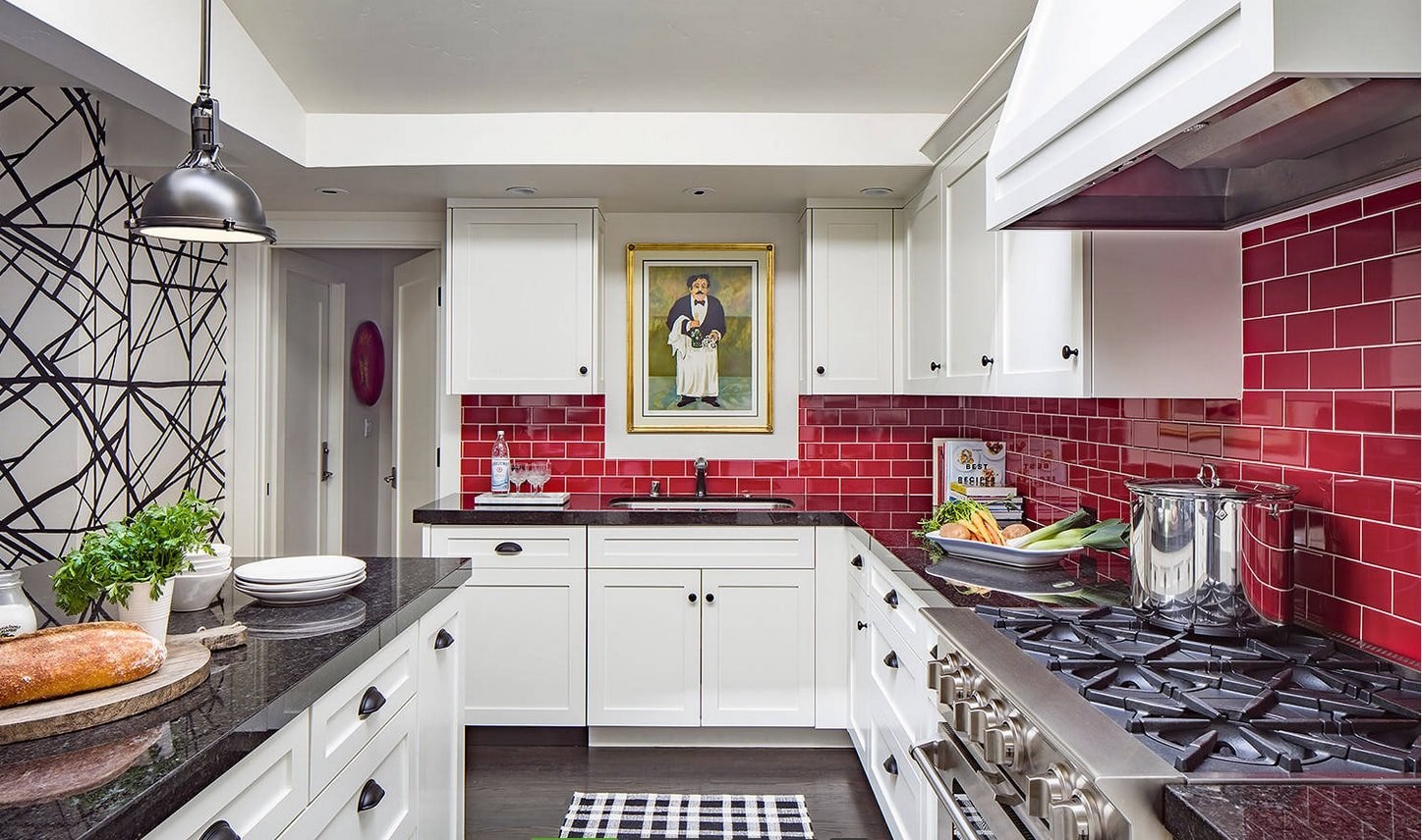 Белая кухня с красным фартуком