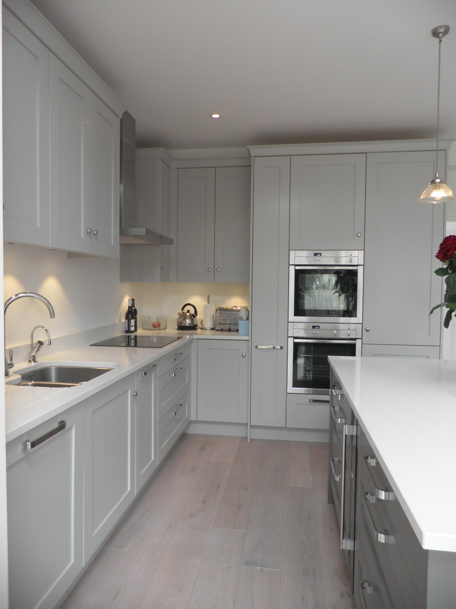 Бежевая кухня с серой столешницей и серым фартуком (41 фото)