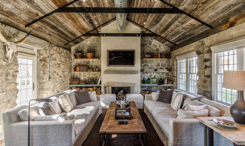 Гостиная с камином в деревенском стиле